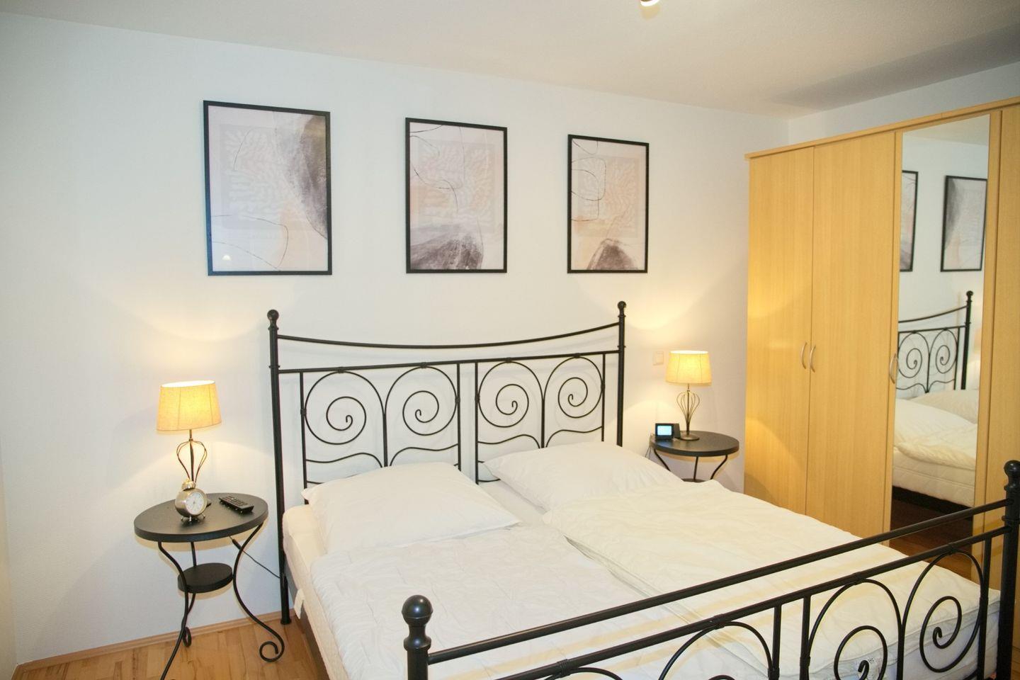 Das Schlafzimmer, ebenfalls mit Parkettboden ausgestattet, bietet ein großes Doppelbett, einen geräumigen 5-türigen Kleiderschrank, einen Radiowecker und einen weiteren TV. Das Badezimmer ist hell gefliest und verfügt über eine Dusche mit Echtglastrennwand.