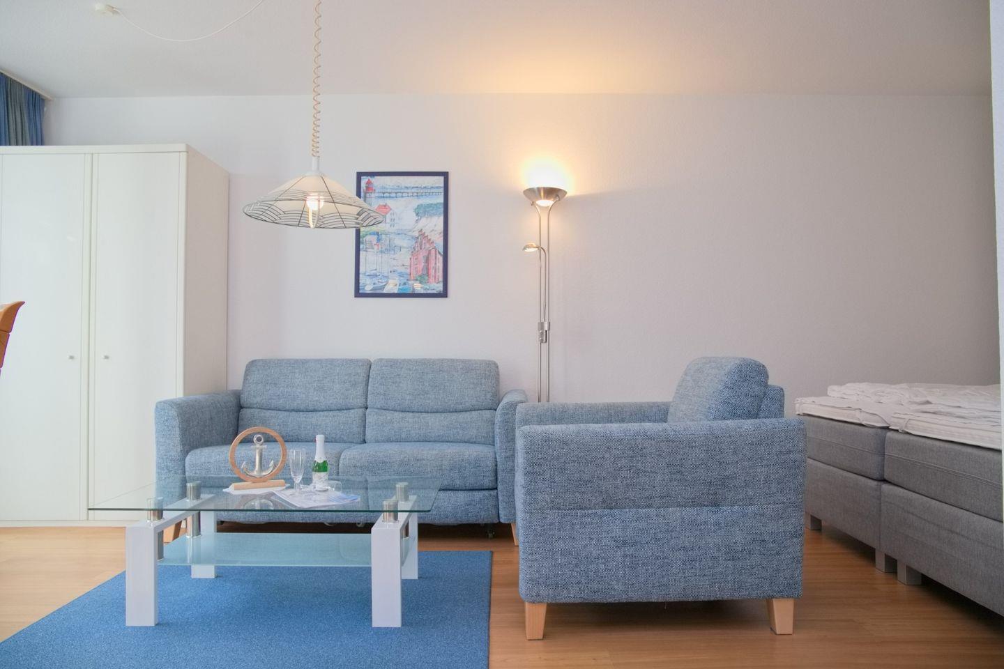Diese 1-Zimmer-Ferienwohnung im 1 Obergeschoss mit möblierten Balkon bietet im Wohnzimmer einen Zweisitzer der zu einer Schlafcouch umfunktioniert werden kann, zwei Sessel, einenFlach-TV, eine Stereoanlage, ein Doppelboxspringbett und einen Essbereich mit 3 Stühlen.