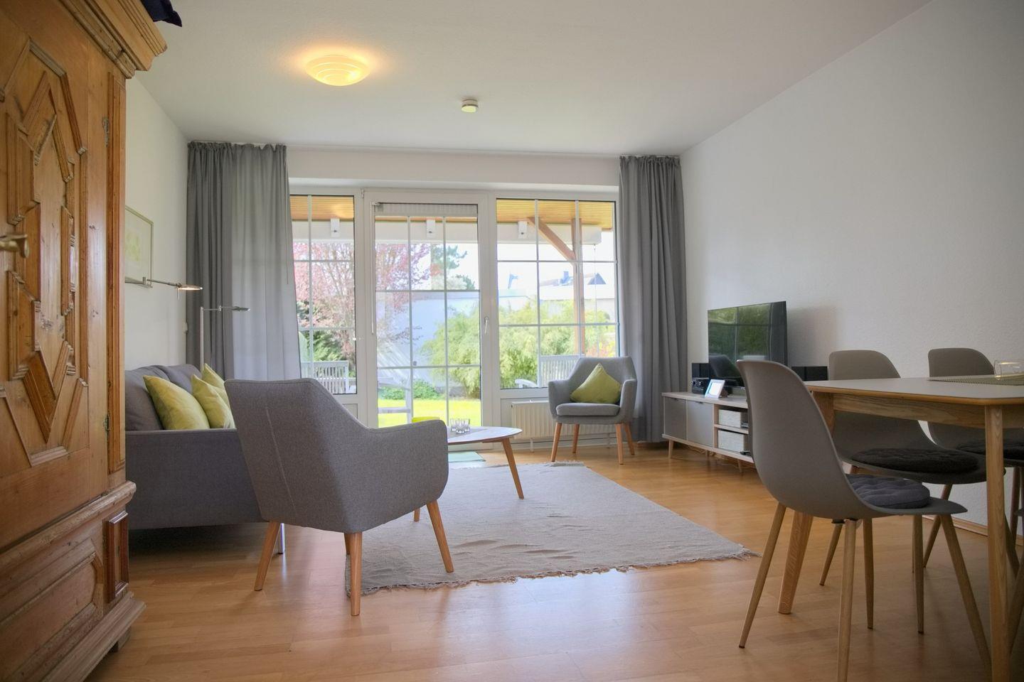 ist ausgestattet mit einer Couchgarnitur, zwei Sesseln, einem Flach TV und