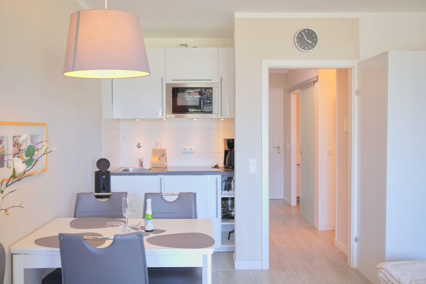 Die offen gehaltene Küchenzeile ist ausgestattet mit einem Cerankochfeld, einem Kühlschrank mit Gefrierfach, einer Kaffeemaschine, einem Wasserkocher, einem Toaster und einer Mikrowelle.
