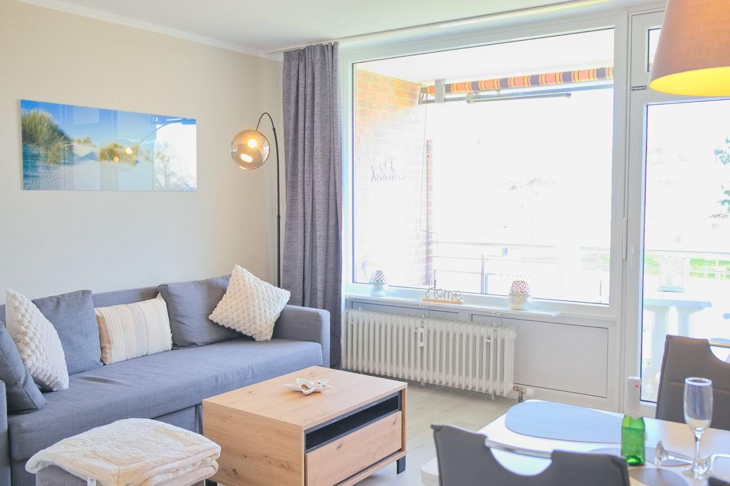 Das Wohnzimmer mit großer Fensterfront und Blick auf die See verfügt über eine Schlafcouch. Zur Unterhaltung stehen Ihnen hier ein Flachbild TV und eine Stereoanlage mit CD bereit.
