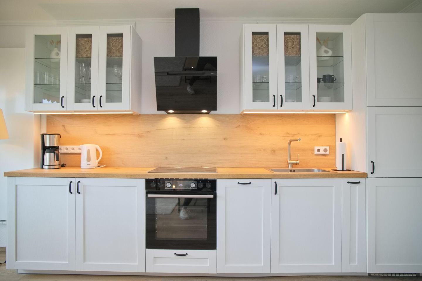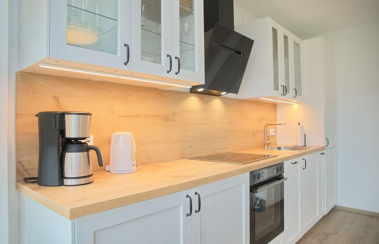 Die offene, moderne Landhausküche ist mit einem Kühlschrank inkl. Gefrierfach, Geschirrspüler, Backofen, großem Kochfeld, Dunstabzugshaube, Kaffeemaschine, Wasserkocher und Toaster eingerichtet. In der Küchenrückwand befindet sich ein Einbau-Radio, über Bluetooth können Sie auch ihre eigene Musik abspielen.