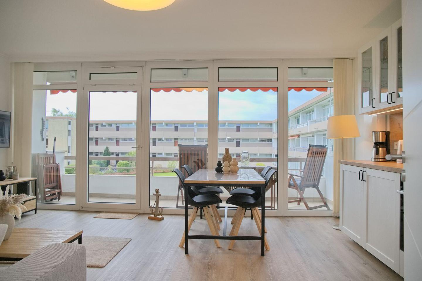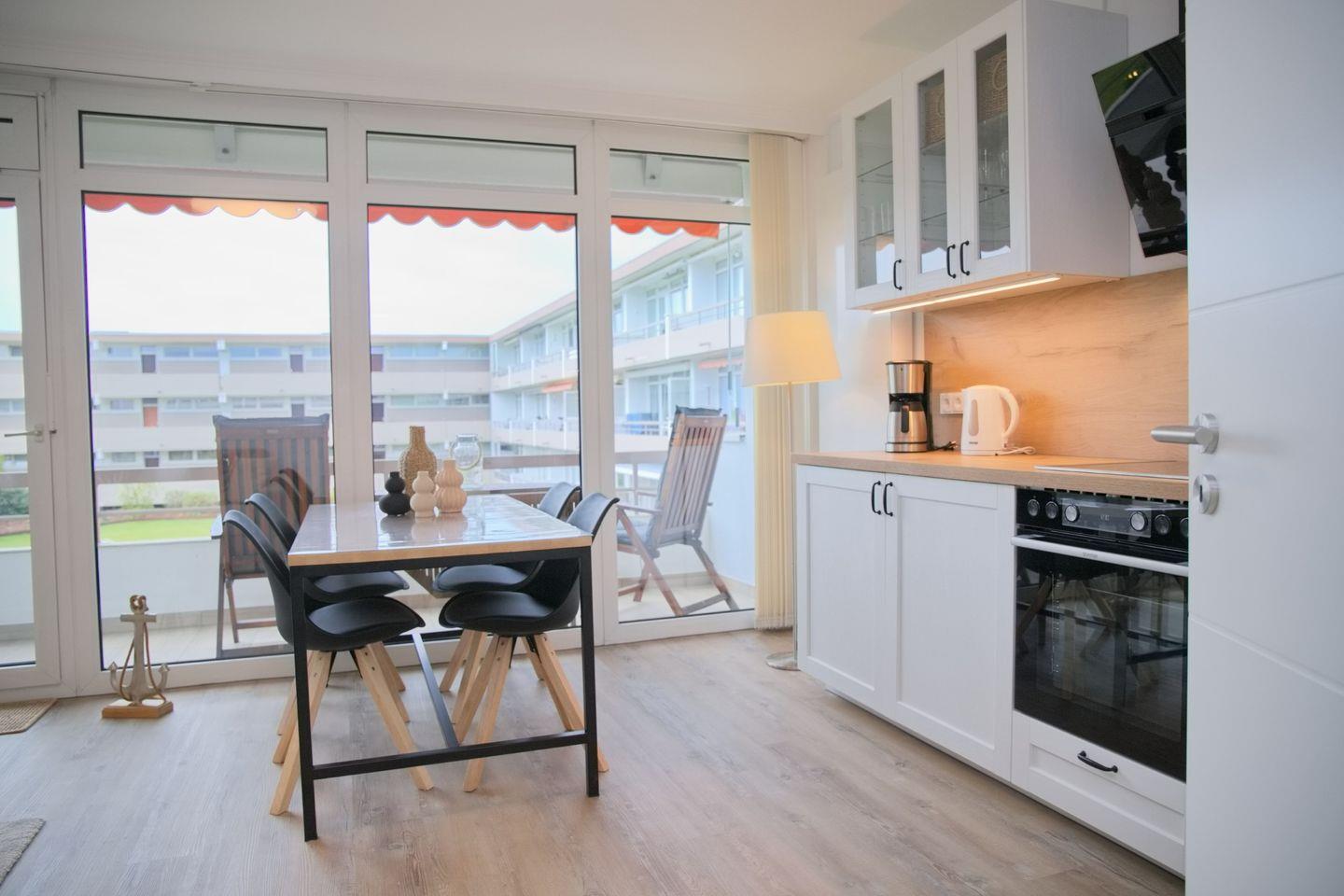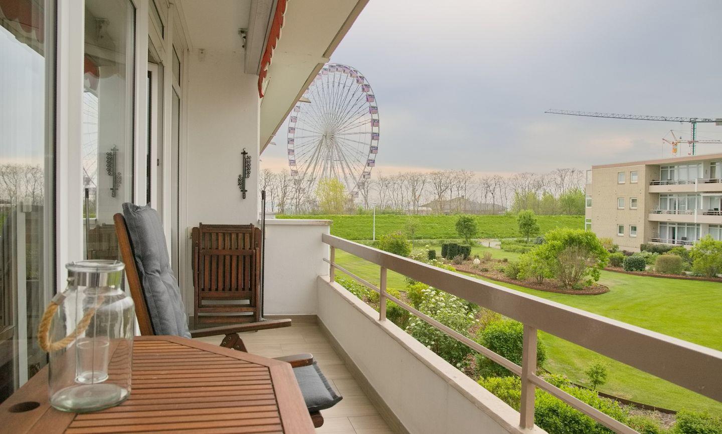Vom Wohnzimmer gelangen Sie auf unseren schönen, sonnigen Balkon (Süd-Westausrichtung) mit seitlichem Blick über den Deich und das Meer sowie in den schön angelegten Garten. Der Balkon ist mit Markise und Gartenmöbeln aus Holz ausgestattet.