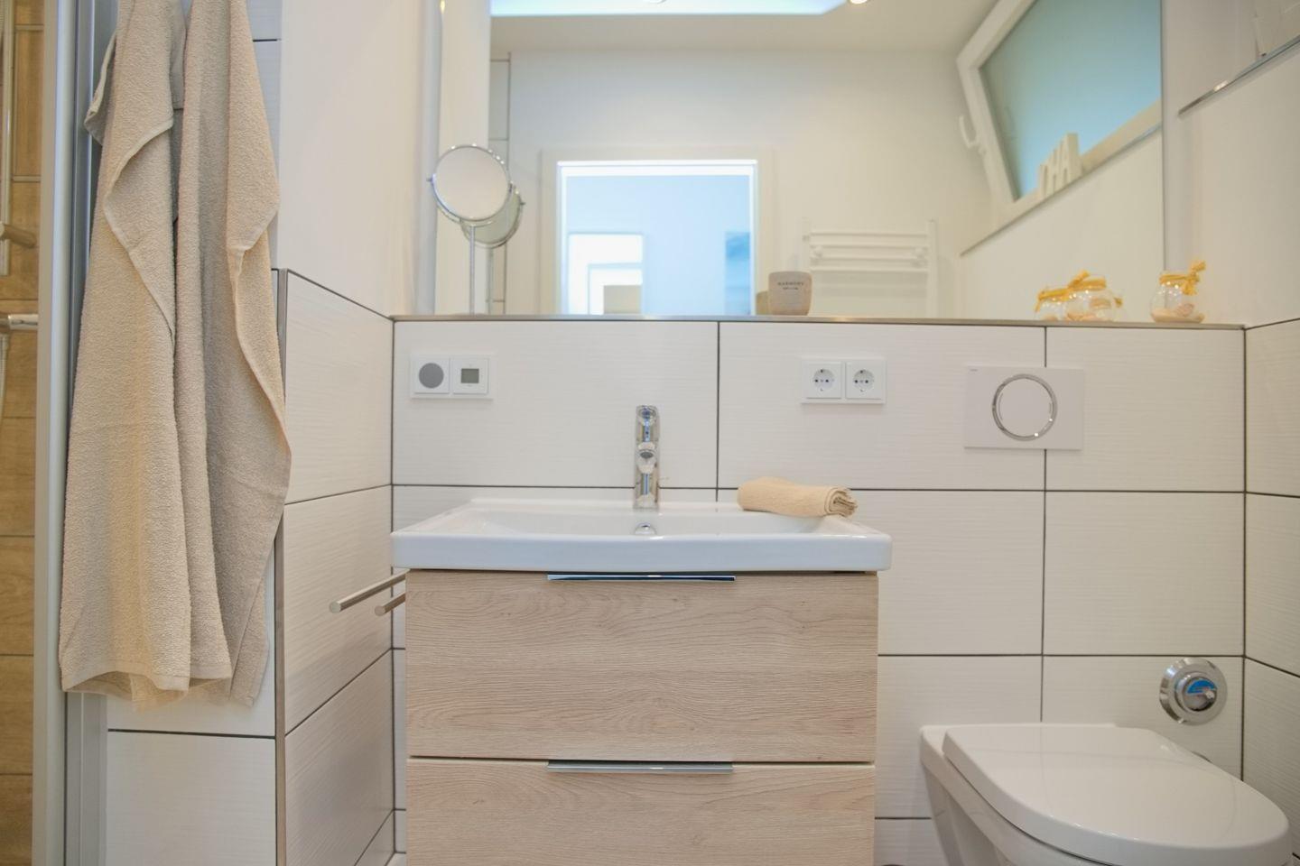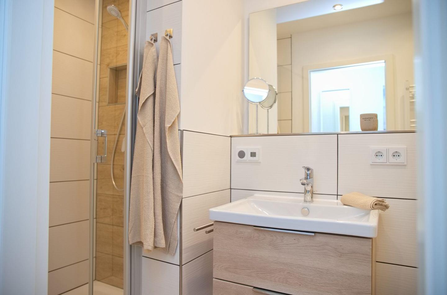 Das Tageslicht-Badezimmer ist mit einer großen, begehbaren Dusche, Design-Waschtisch, großem Spiegel, WC und Handtuchheizung perfekt ausgestattet.