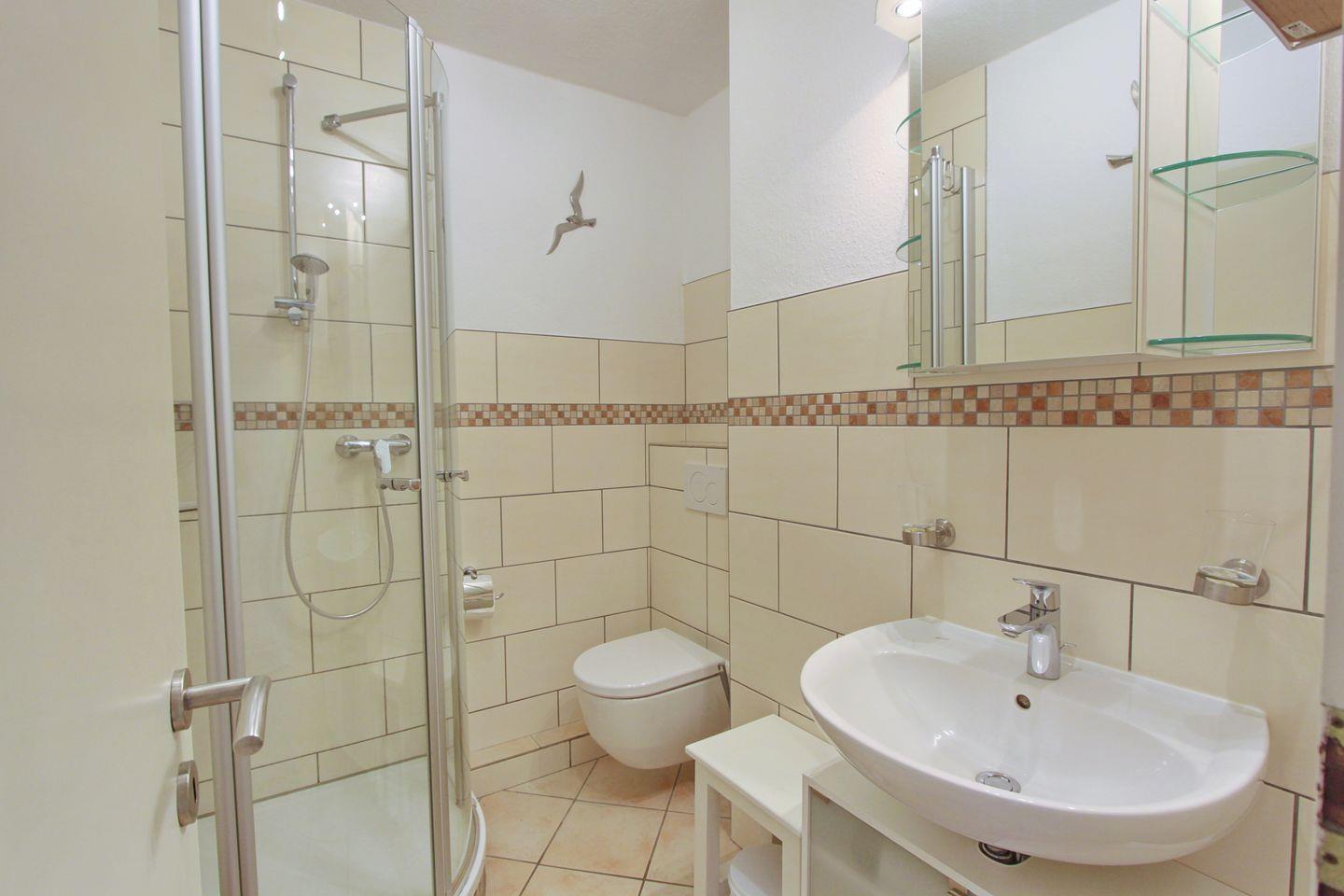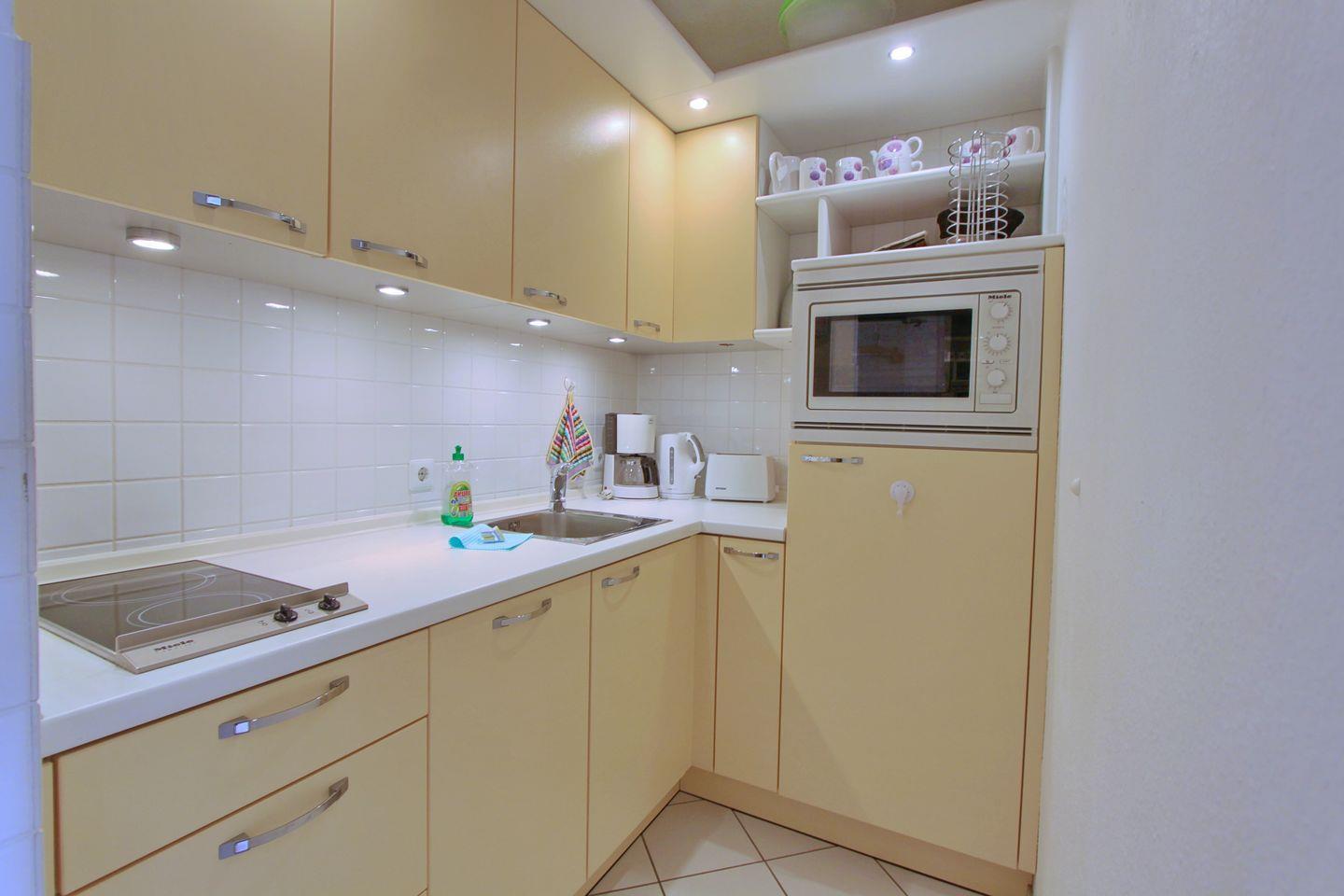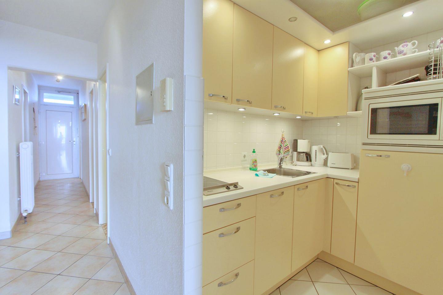 Zurück auf den Flur geht es in das innen liegende Duschbad mit WC, Waschbecken, Föhn und beleuchteten Spiegel. Die separate Einbauküche liegt ein Raum weiter und ist ausgestattet mit einem 2- Platten- Cerankochfeld, Mikrowelle mit Grillfunktion, Geschirrspülmaschine, Kühlschrank mit Gefrierfach und weitere kleine nützliche Küchenhelfer. Geradeaus über den Flur befindet sich das Wohnzimmer. Hier steht Ihnen neben einer gemütlichen Eckcouch ein Flach TV und Stereoanlage mit Bluetooth zur Verfügung. Der Essbereich hat hier auch seinen Platz.