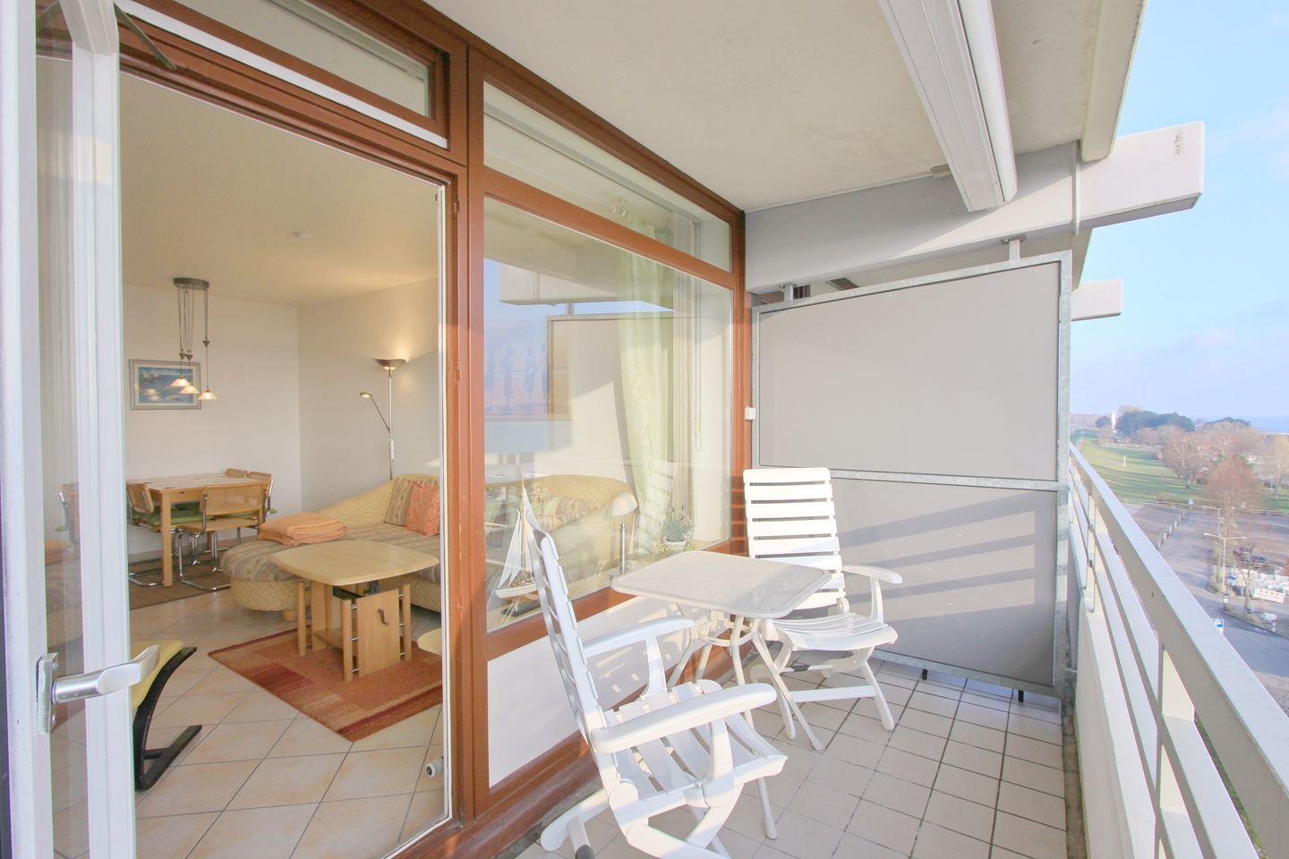 Der möblierte Balkon mit Markise in Südlage bietet einen herrlichen Blick über die Lübecker Bucht. Mit dem Fernglas haben Sie die Möglichkeit auf die andere Seite der Bucht zu sehen.
