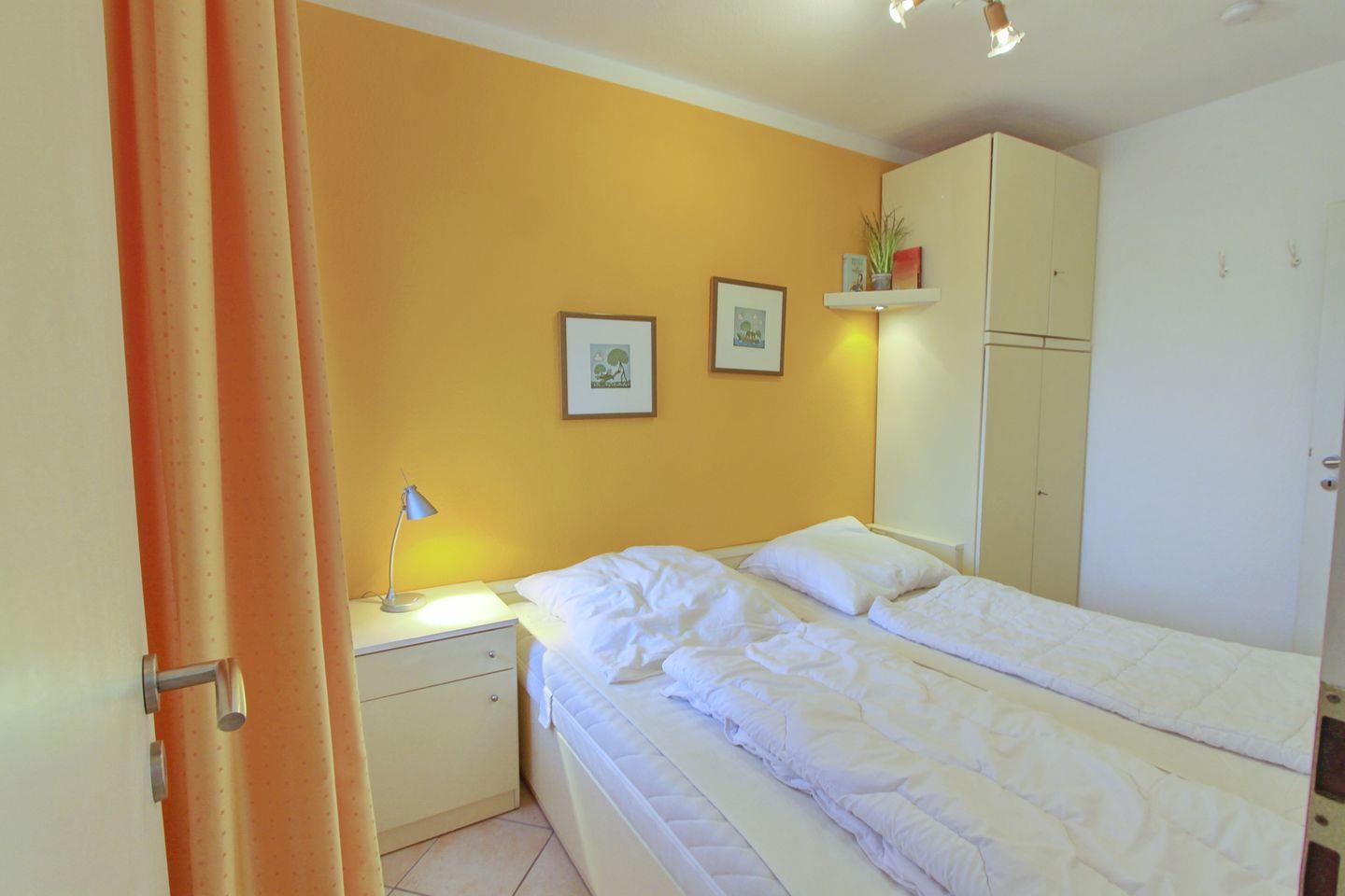 Zu Ihrer Linken gelangen Sie in das Schlafzimmer, welches durch zwei Türen zu begehen ist, mit Doppelbett (2x90x200 cm), Kleiderschrank, Radiowecker und Nachtschränken. Zur Verdunklung des Fensters, sind Vorhänge vorhanden.