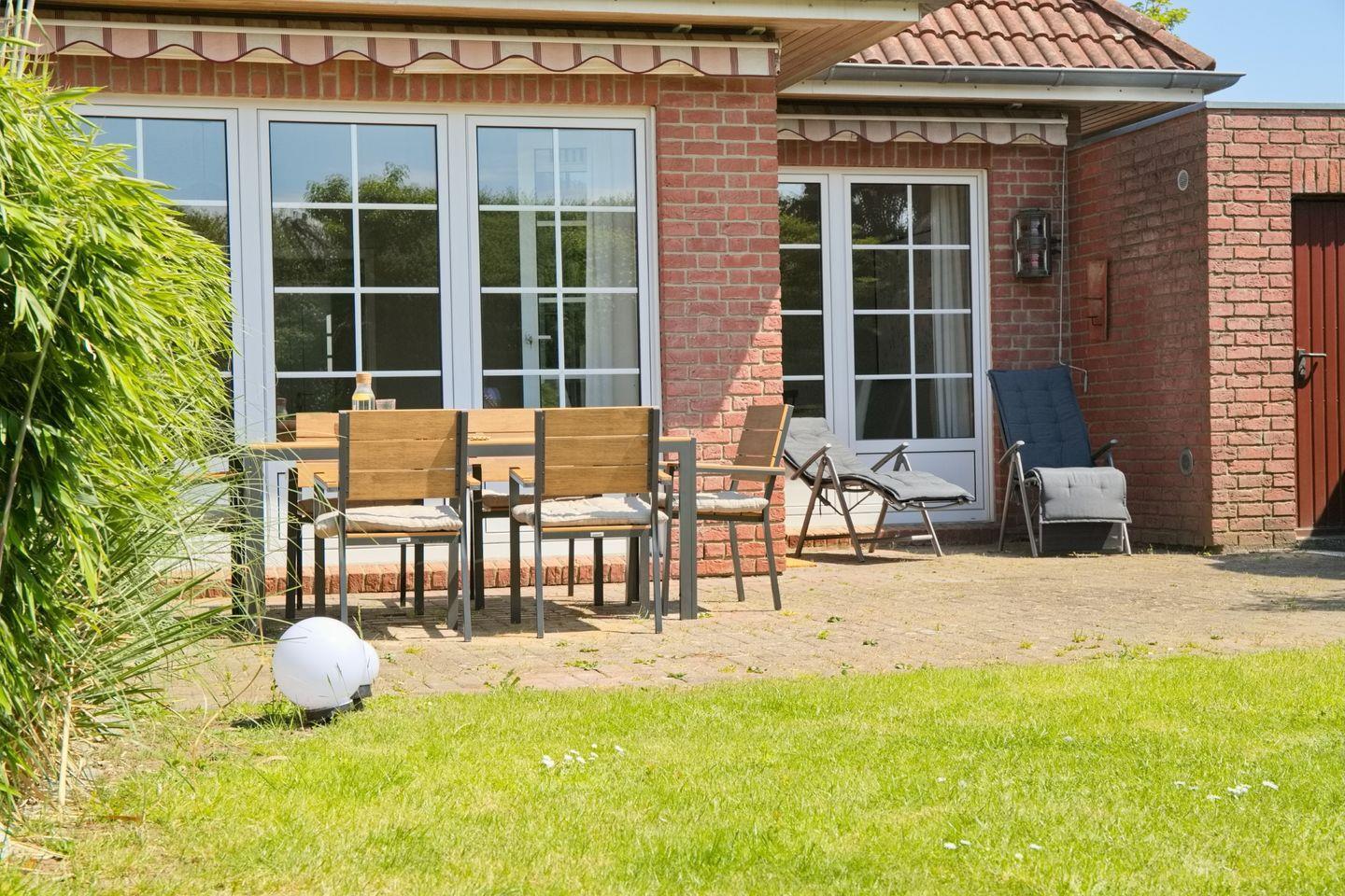 Der schön angelegte Garten mit Südwest-Ausrichtung ist eingezäunt und bietet Zugang zu den angrenzenden Feldern durch ein kleines Gartentor. Die Terrasse ist mit einem Esstisch für 6 Personen und zwei Liegestühlen möbliert, während Markisen für angenehmen Schatten sorgen.