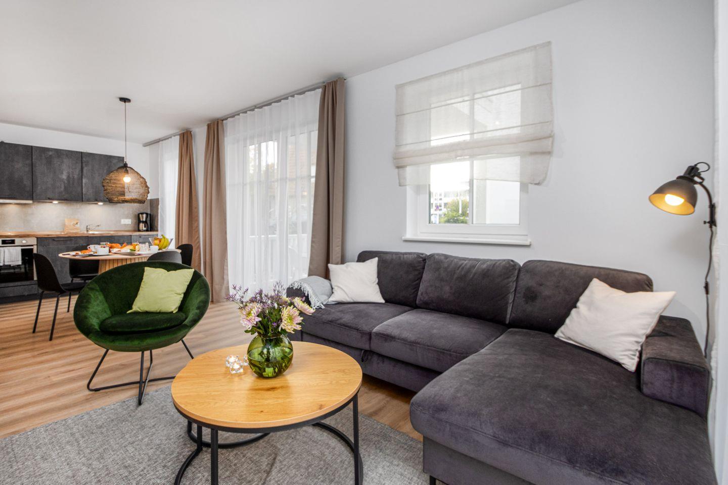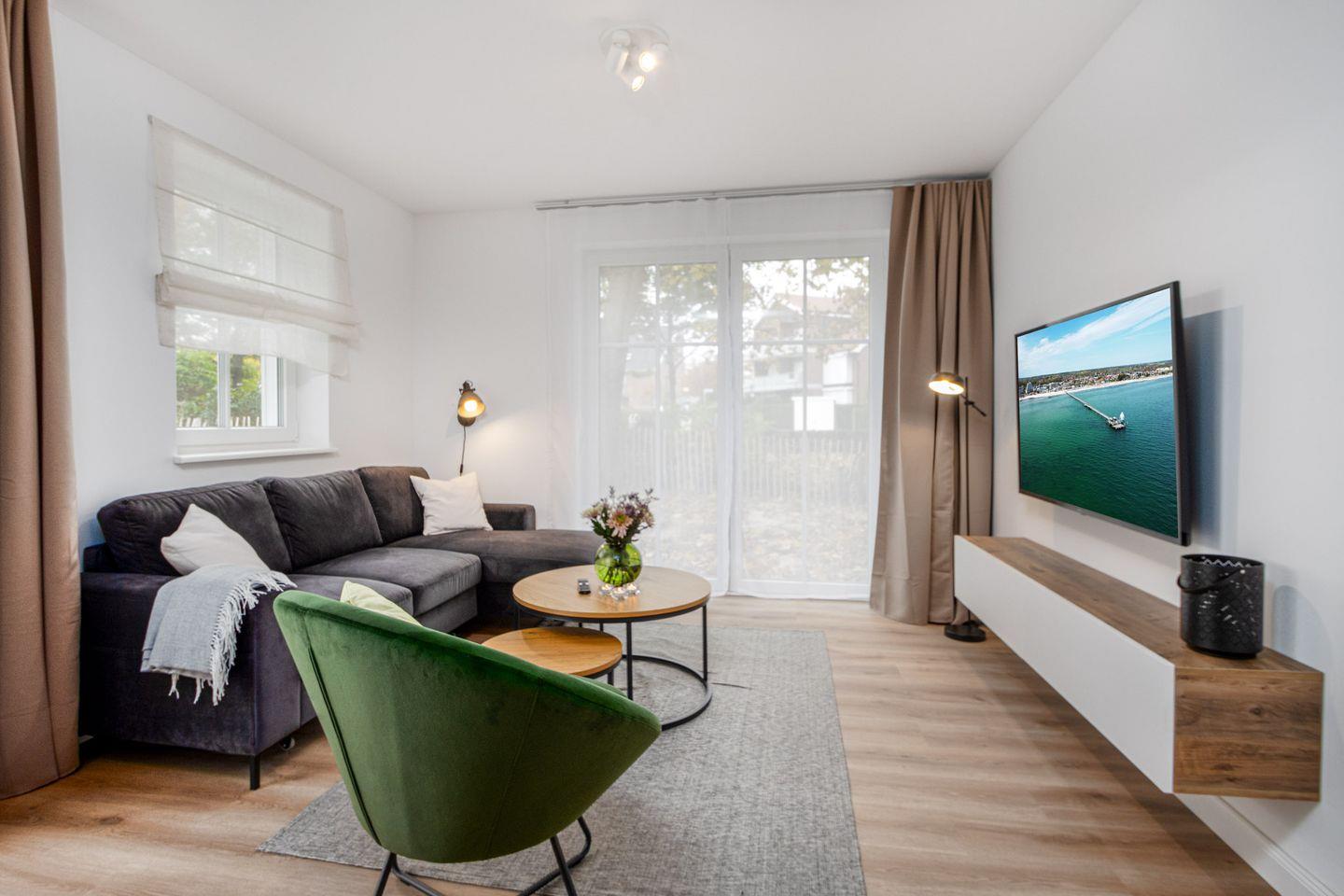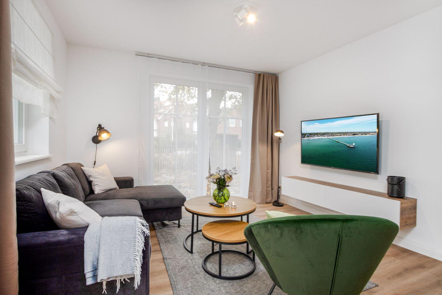 Das Wohnzimmer ist ein Ort der Entspannung und Unterhaltung. Eine komfortable Schlafcouch mit einer großzügigen Liegefläche von ca. 140x200 cm bietet Platz für zwei weitere Gäste. Ein Sessel lädt zum Lesen oder Entspannen ein, während der Smart-TV Ihnen Zugang zu einer Vielzahl von Unterhaltungsoptionen bietet.
