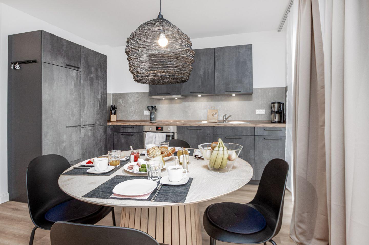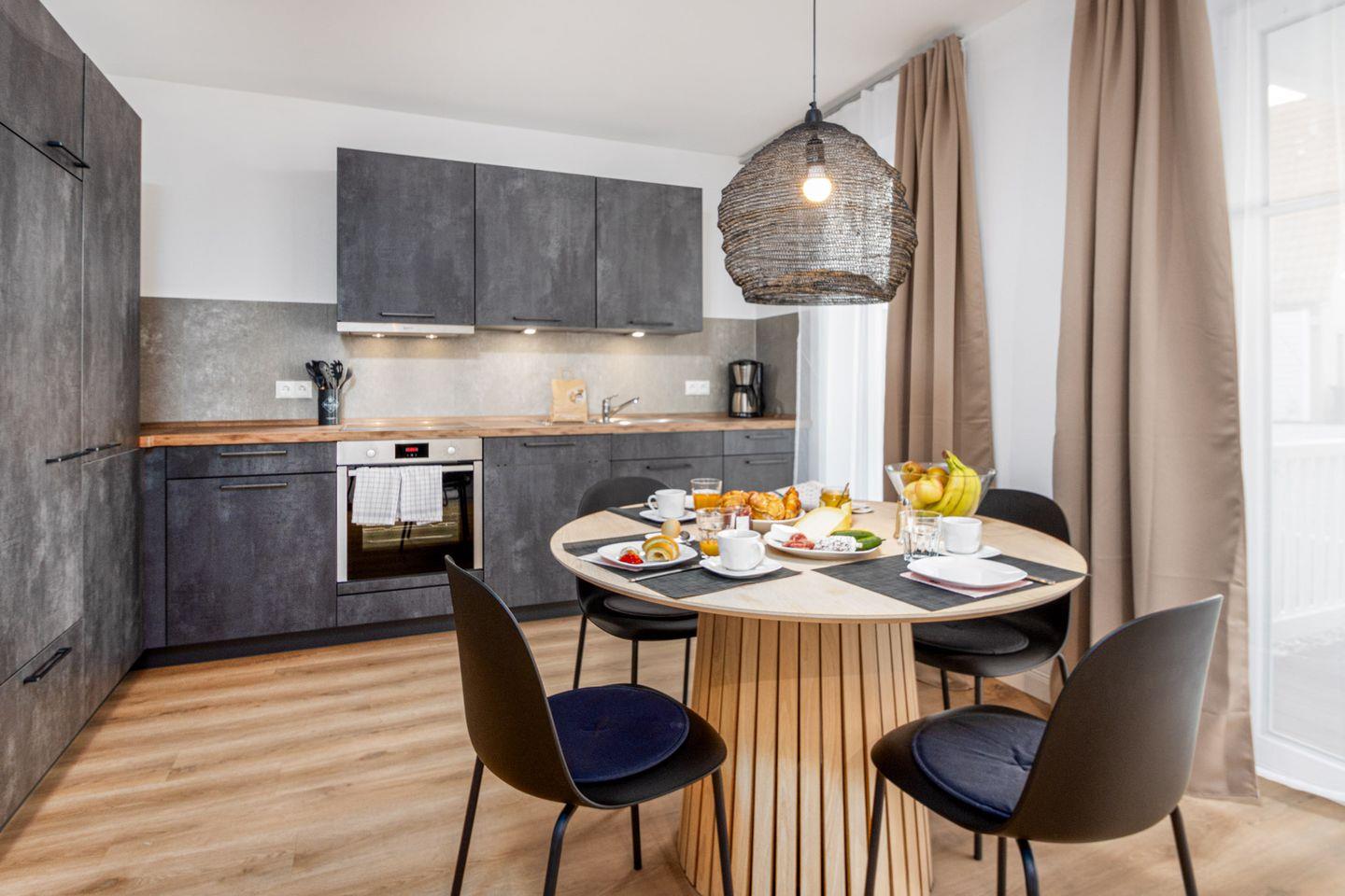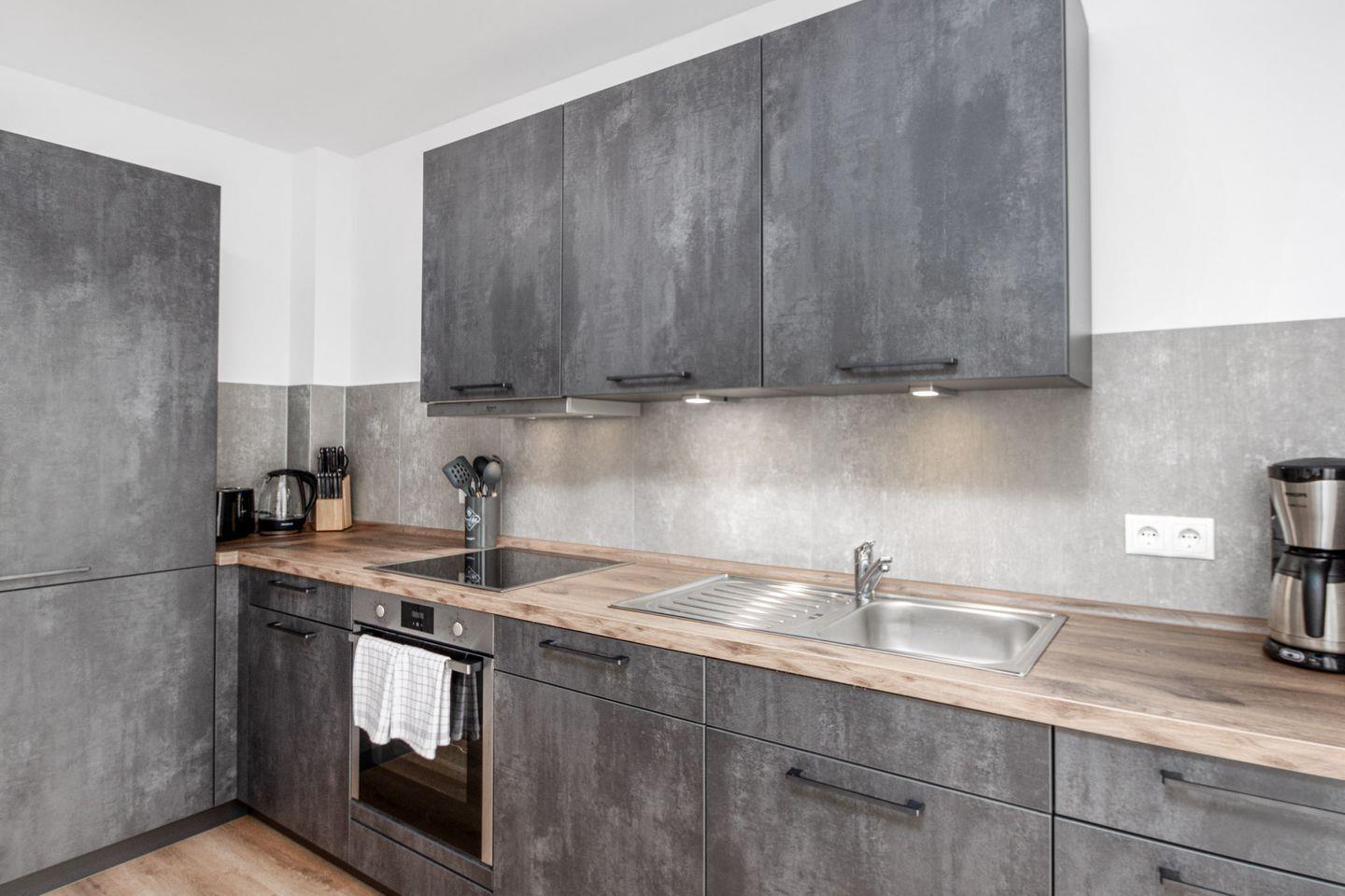 Die offene Küche zum Wohnbereich ist voll ausgestattet mit modernen Geräten und allen Annehmlichkeiten, die Sie benötigen, um köstliche Mahlzeiten zuzubereiten. Ein Induktionskochfeld, Backofen, Spülmaschine, Kühlschrank mit Gefrierfach, Wasserkocher, Toaster und Kaffeemaschine stehen zu Ihrer Verfügung.