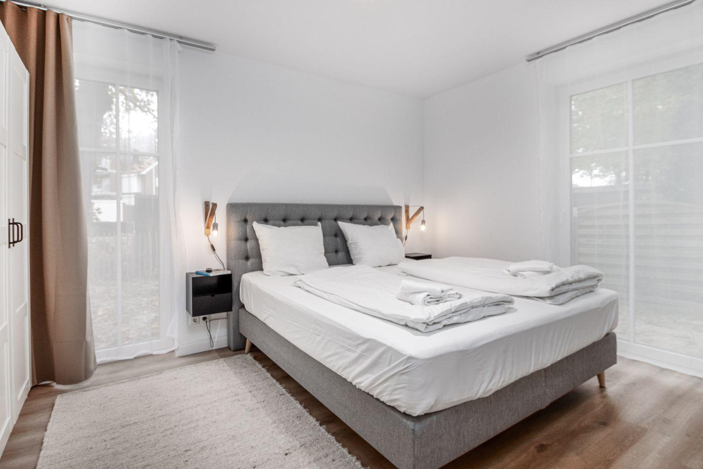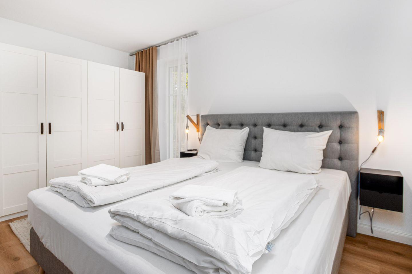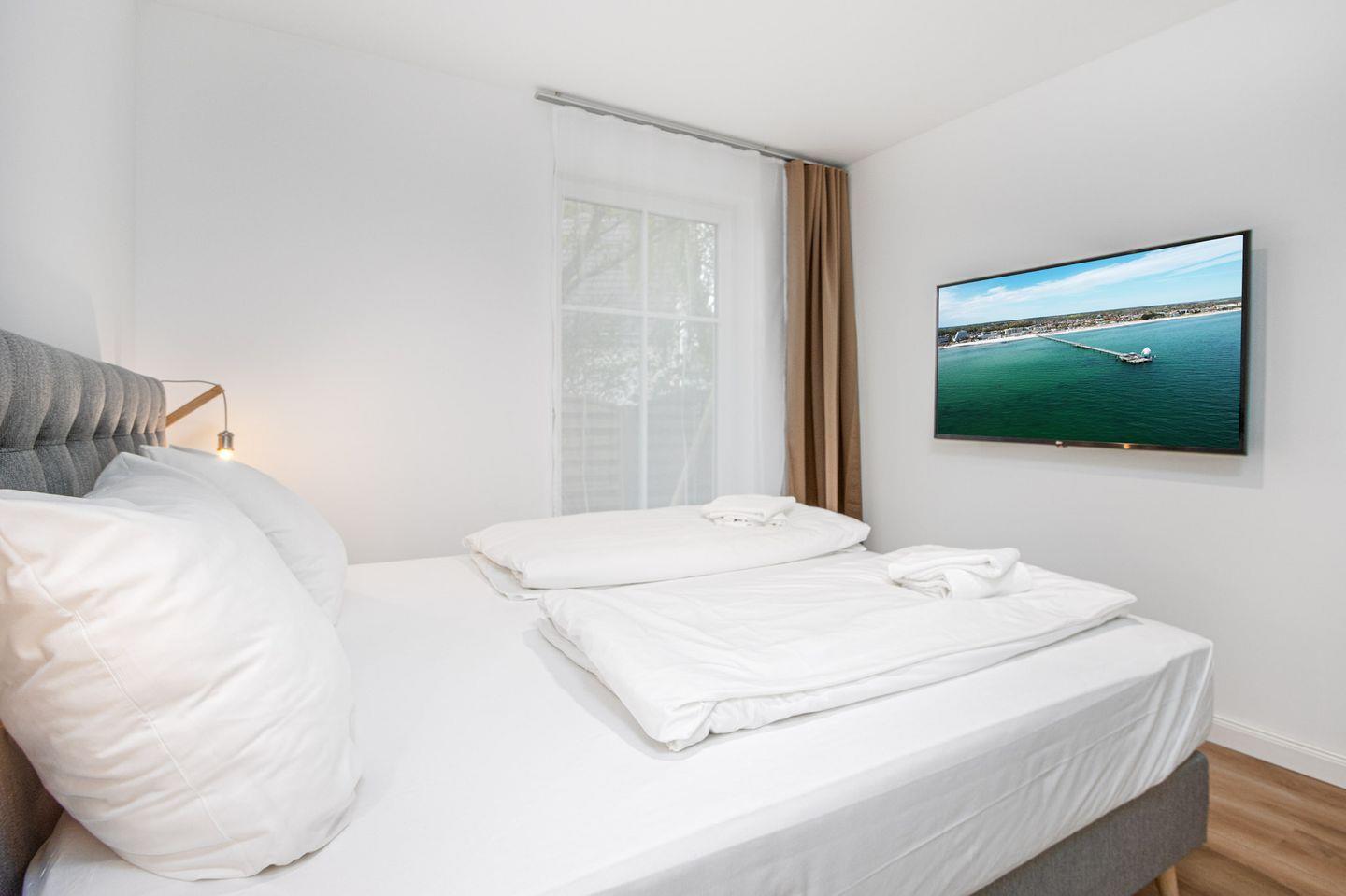 Das Schlafzimmer ist eine Oase der Ruhe und Erholung. Ein luxuriöses Boxspringbett mit einem durchgehenden Topper und einer großzügigen Liegefläche von 180x200 cm verspricht erholsame Nächte. Ein geräumiger Kleiderschrank bietet ausreichend Stauraum für Ihre persönlichen Gegenstände, während ein weiterer Smart-TV für zusätzliche Unterhaltung sorgt. Verdunkelungsgardinen garantieren eine erholsame Nachtruhe.