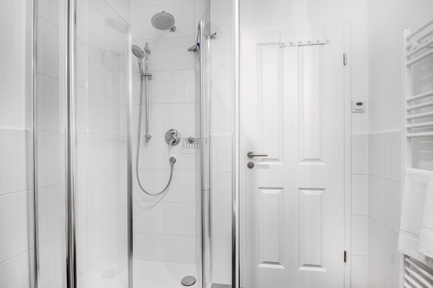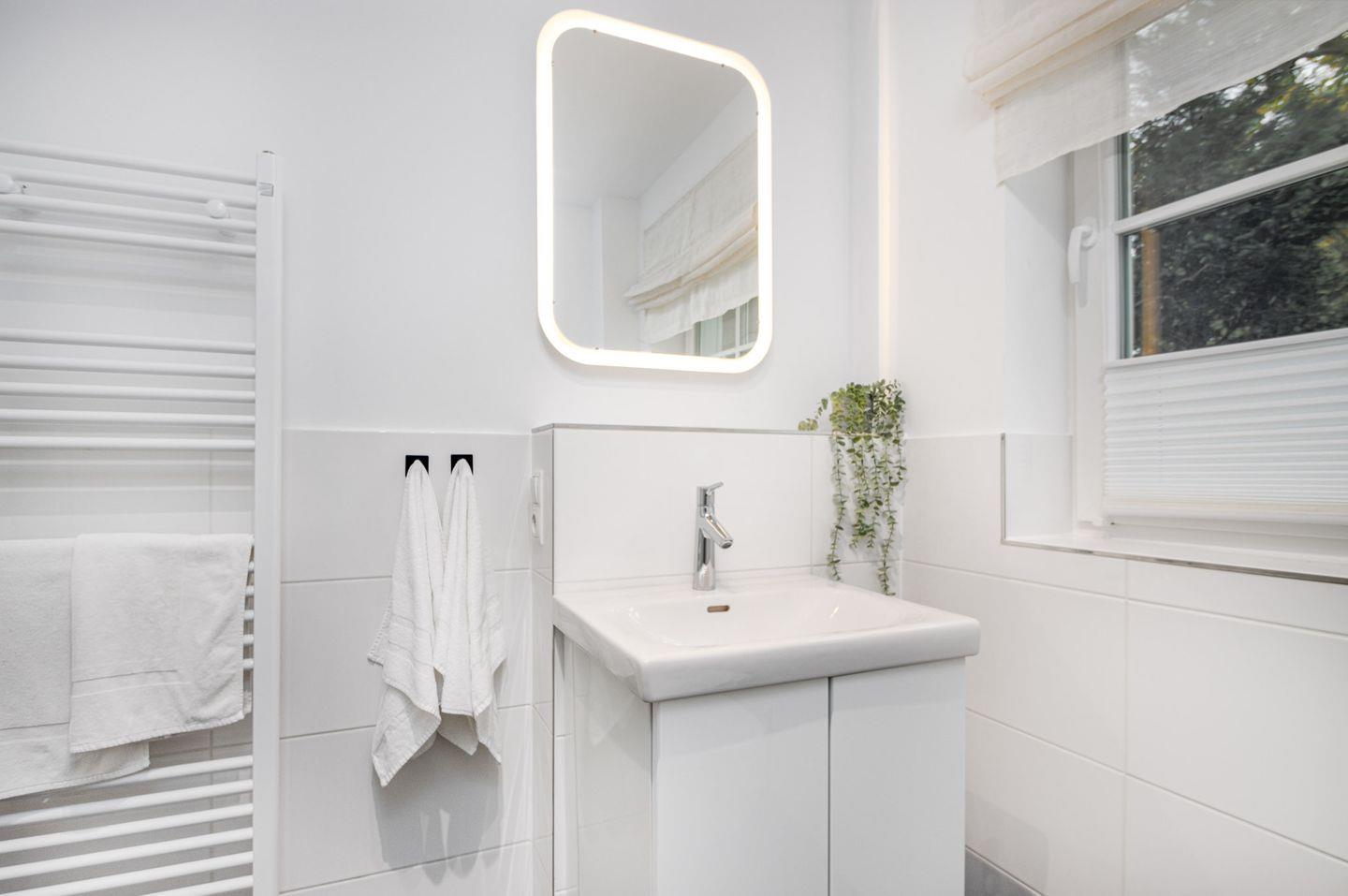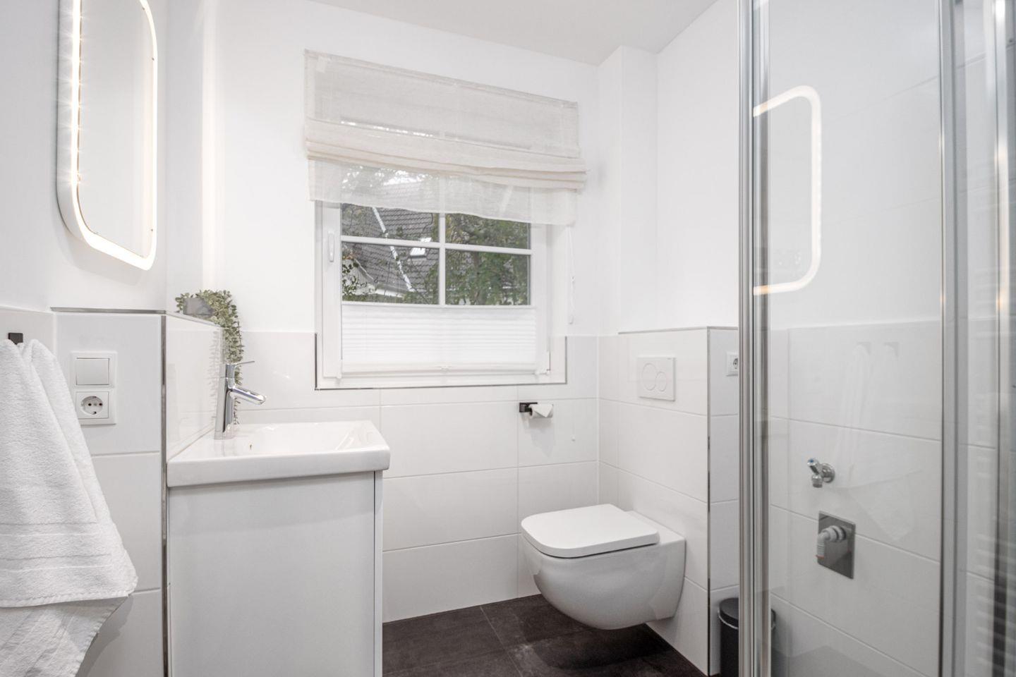 Das Badezimmer bietet eine entspannende Atmosphäre und verfügt über eine Echtglas-Duschkabine mit Rainshower, WC, Waschtisch, beleuchteten Spiegel und ein Fenster für natürliches Licht und Frischluft.