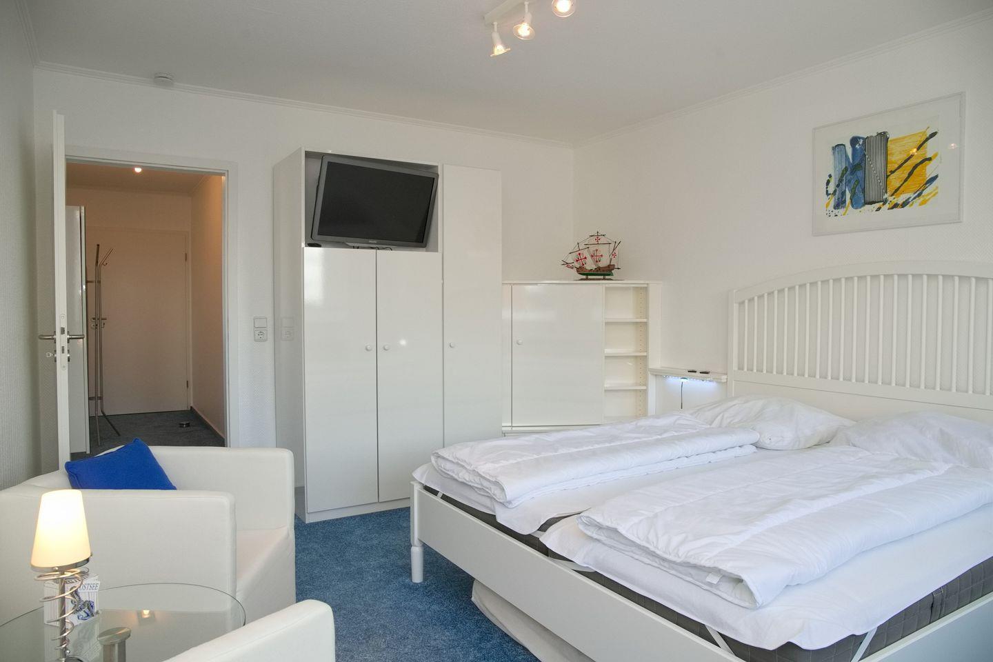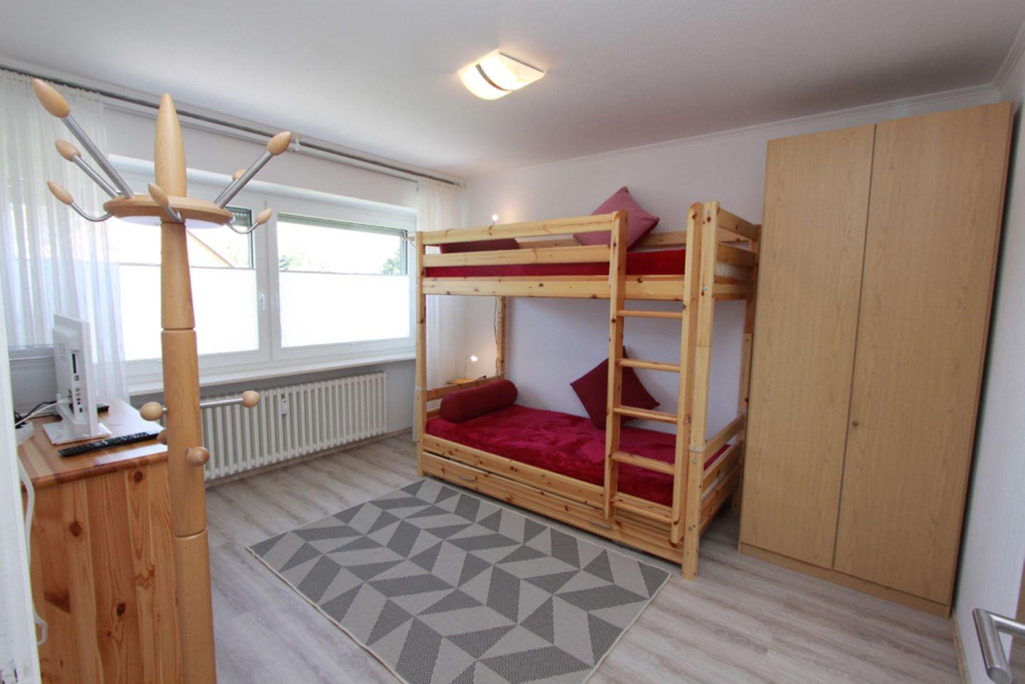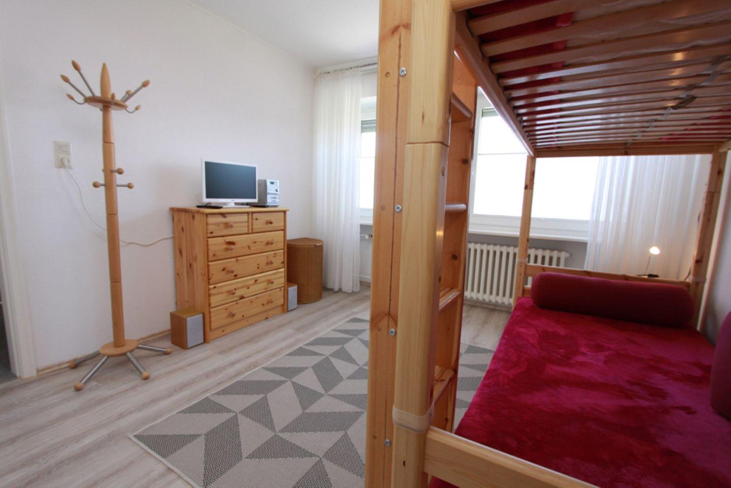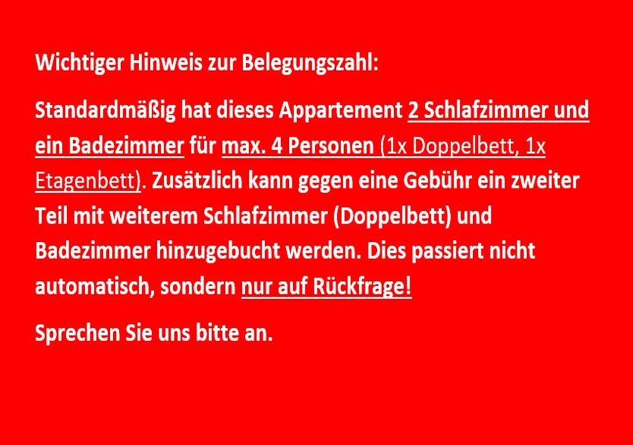 Weiter finden sie zwei Schlafräume. Das erste verfügt über ein Doppelbett mit Einbaukleiderschrank und Flach TV, das zweite über ein Etagenbett, einen Kleiderschrank, eine Kommode und einen weiteren Flach TV. Bei Bedarf steht ein weiteres Schlafzimmer mit Bad und separatem Zugang( Drehknauf ) für weitere enge Familienmitglieder bzw. Großeltern gegen Aufpreis zur Verfügung.