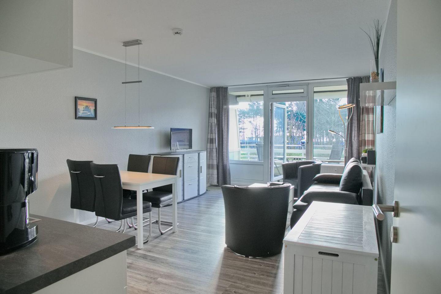 Der helle und modern gestaltete Wohnraum des Domizils bietet Ihnen eine Schlafcouch mit zwei Sesseln, einen Essbereich für bis zu 4 Personen sowie eine offene Küche, die direkt an den Essbereich grenzt.