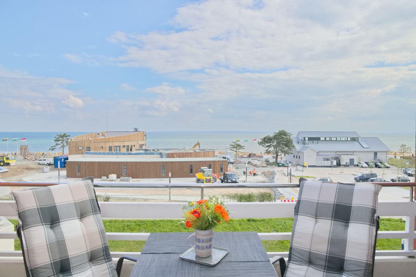 Moderne und stilvolle Ferienwohnung mit möbliertem Süd-Balkon und Markise sowie Seeblick. Nur wenige Meter zum feinen Sandstrand in Grömitz.