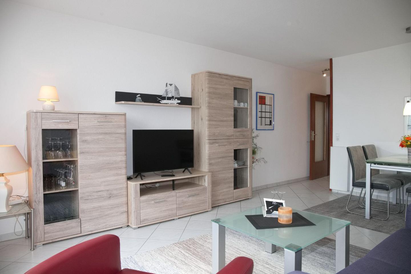 Sehr schöne 2-Zimmer-Wohnung in der 4. Etage mit möbliertem Balkon in Südrichtung, einem traumhaften Meerblick mit Markise. Im Wohnzimmer gibt es eine Schlafcouch für 2 Personen, großer Flach-TV (123 cm) und DVD, Radio mit CD-Player sowie kostenloser Internetzugang ab mitte Mai für unsere Gäste während Ihres Aufenthaltes. An der Essecke mit 4 Stühlen können Sie Ihren Urlaubstag genussvoll bei einem selbst gekochten Essen ausklingen lassen. Die Küche ist mit einem 4-Plattenherd, einem Kühlschrank mit Gefrierfach, einer Spülmaschine, einer Mikrowelle, einer Kaffeemaschine, einem Wasserkocher und einem Toaster ausgestattet. Im Schlafzimmer befinden sich ein Doppelbett, zwei Nachttische und ein Kleiderschrank. Die Wohnung verfügt über ein Duschbad/WC.