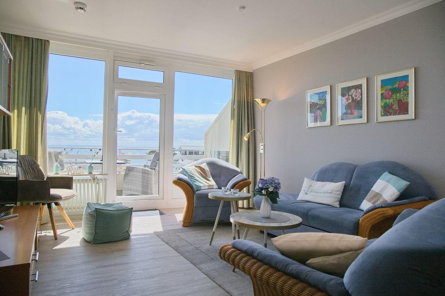 Eine gemütliche 2-Zimmer-Wohnung (ca. 52 qm) in der 4. Etage mit möbliertem Balkon in Südrichtung mit Markise und traumhaftem Seeblick. Im Wohnzimmer gibt es eine Schlafcouch für eine Person, einen 2 Sitzer und einen Sessel, Flach- TV mit HD Programmen, ein Radio mit CD-Player und eine Essecke mit 4 Stühlen. Die Küche ist mit einem Induktionsherd, einem Kühlschrank mit Gefrierfach, einer Spülmaschine, einer Mikrowelle, einer Kaffeemaschine, einem Wasserkocher und einem Toaster ausgestattet. Im Schlafzimmer befinden sich ein Doppelbett, zwei Nachttische und ein großer Kleiderschrank. Außenrollläden sorgen für einen tiefen Schlaf. Die Wohnung verfügt über ein Duschbad/WC und kostenlosem WLAN.