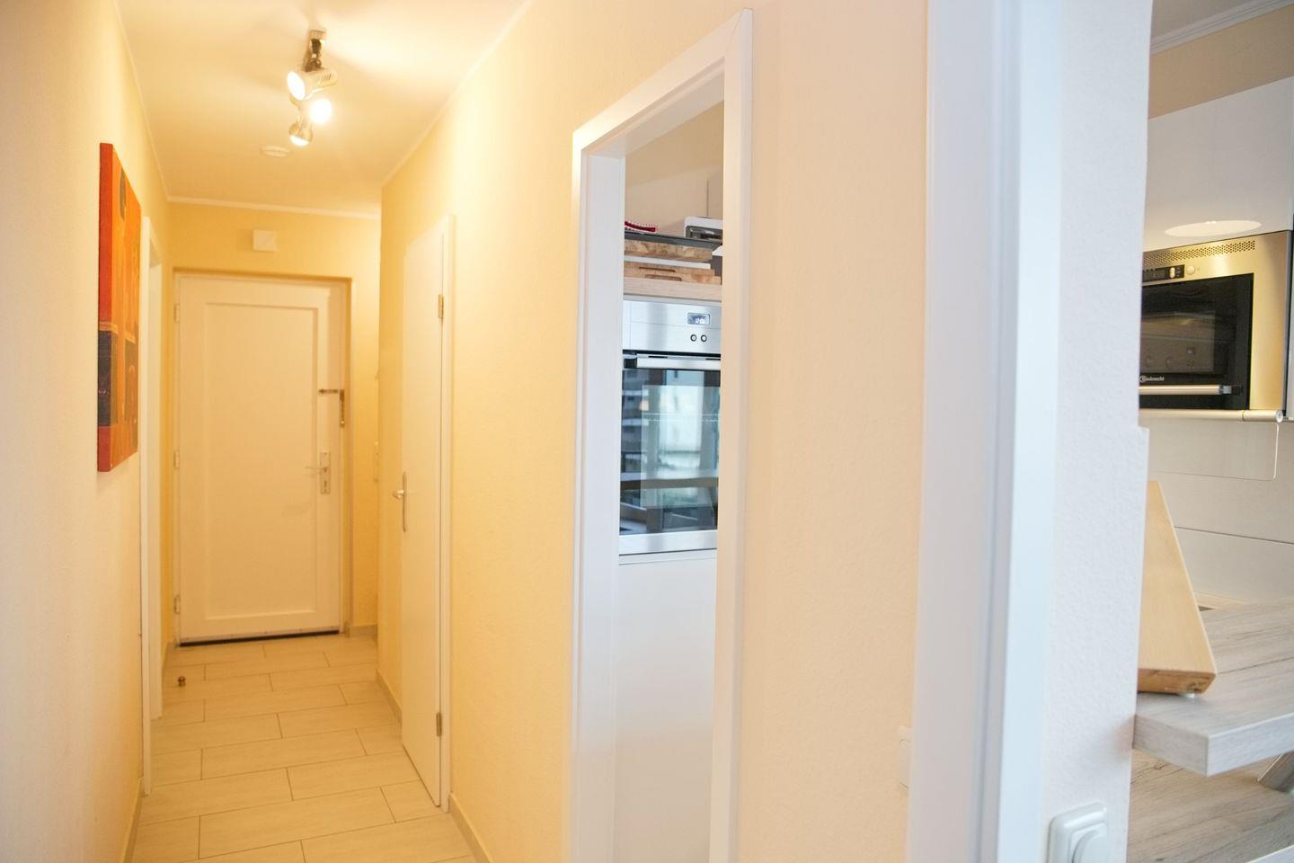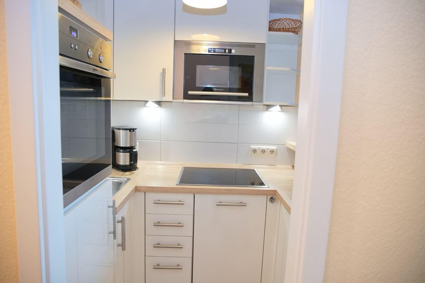 Die Küche ist mit einem Cerankochfeld, einem Backofen, einem Kühlschrank mit Gefrierfach, Geschirrspülmaschine und einer Mikrowelle ausgestattet. Eine Kaffeemaschine, ein Wasserkocher und ein Toaster stehen ebenfalls zur Verfügung.
