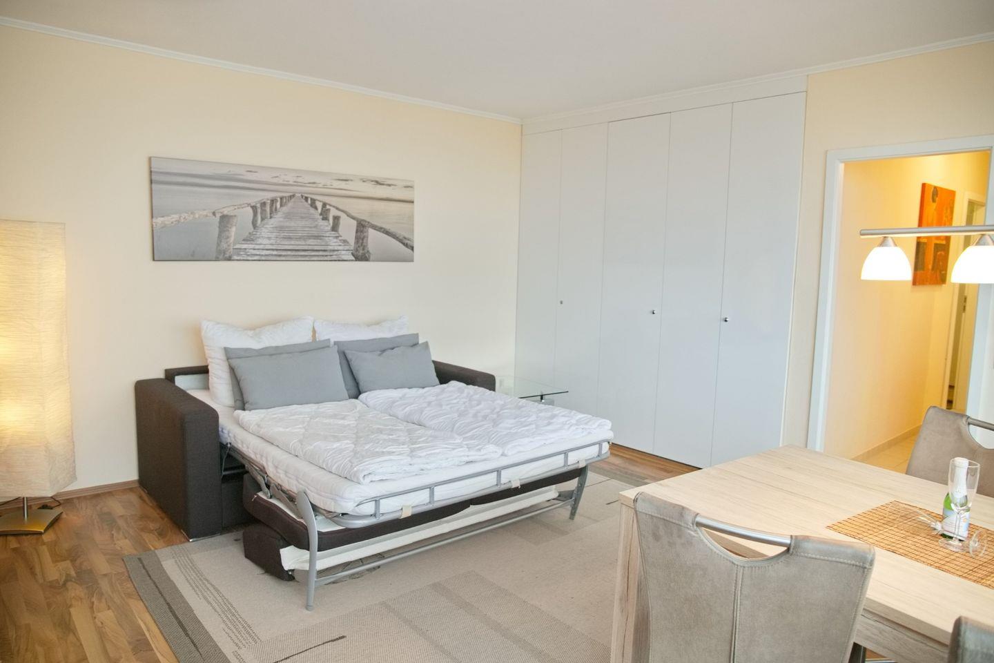 Das Wohnzimmer hat eine Schlafcouch die Sie mit 2 Personen nutzen können, einen Sessel, einen Einbauschrank, eine Flach-TV sowie den Essbereich für 4 Personen und den Zugang zum möblierten Balkon. Starten Sie Ihren Tag bei einem ausgiebigen Frühstück .