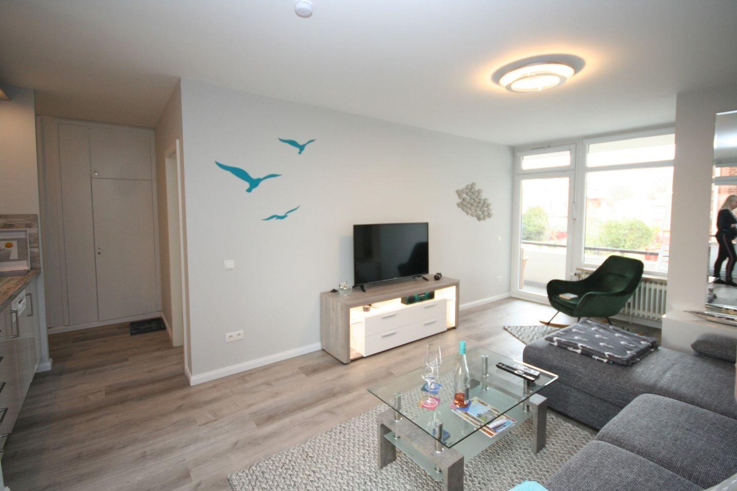Innovative und helle Ferienwohnung mit zwei Balkonen und Seeblick direkt hinter dem Deich, im Zentrum von Grömitz. Die Seebrücke liegt vor der "Tür".