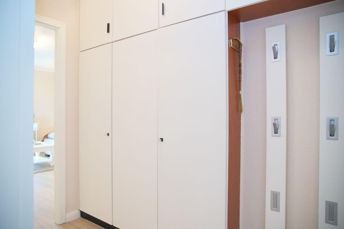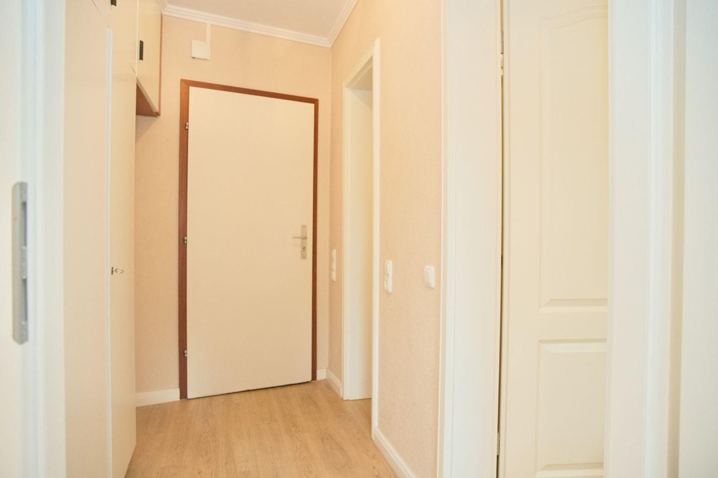 In der Wohnung angekommen, erwartet Sie ein heller schmaler Flur. Hier finden Sie eine Garderobe und einen großen weißen Einbauschrank, mit viel Stauraum.