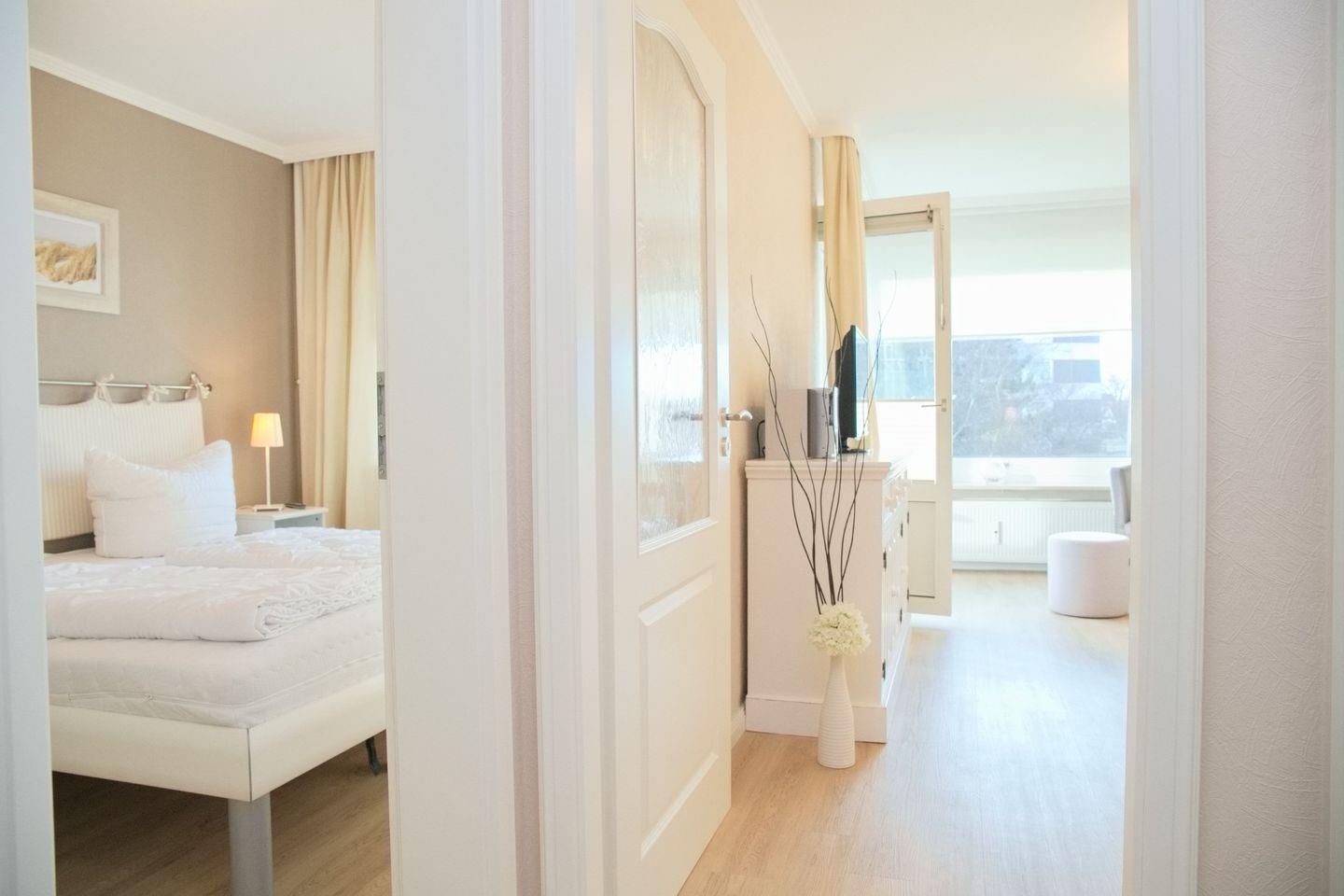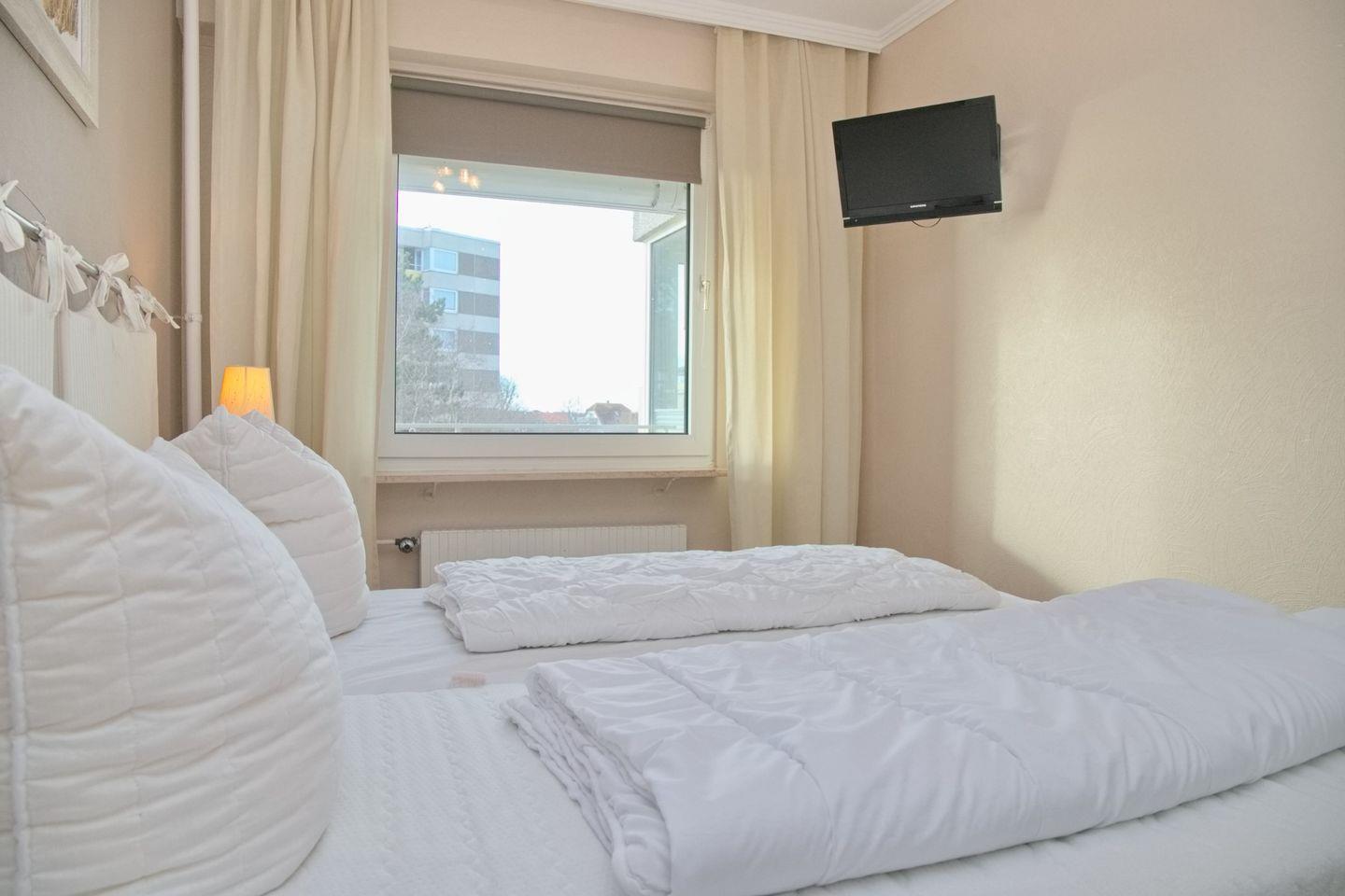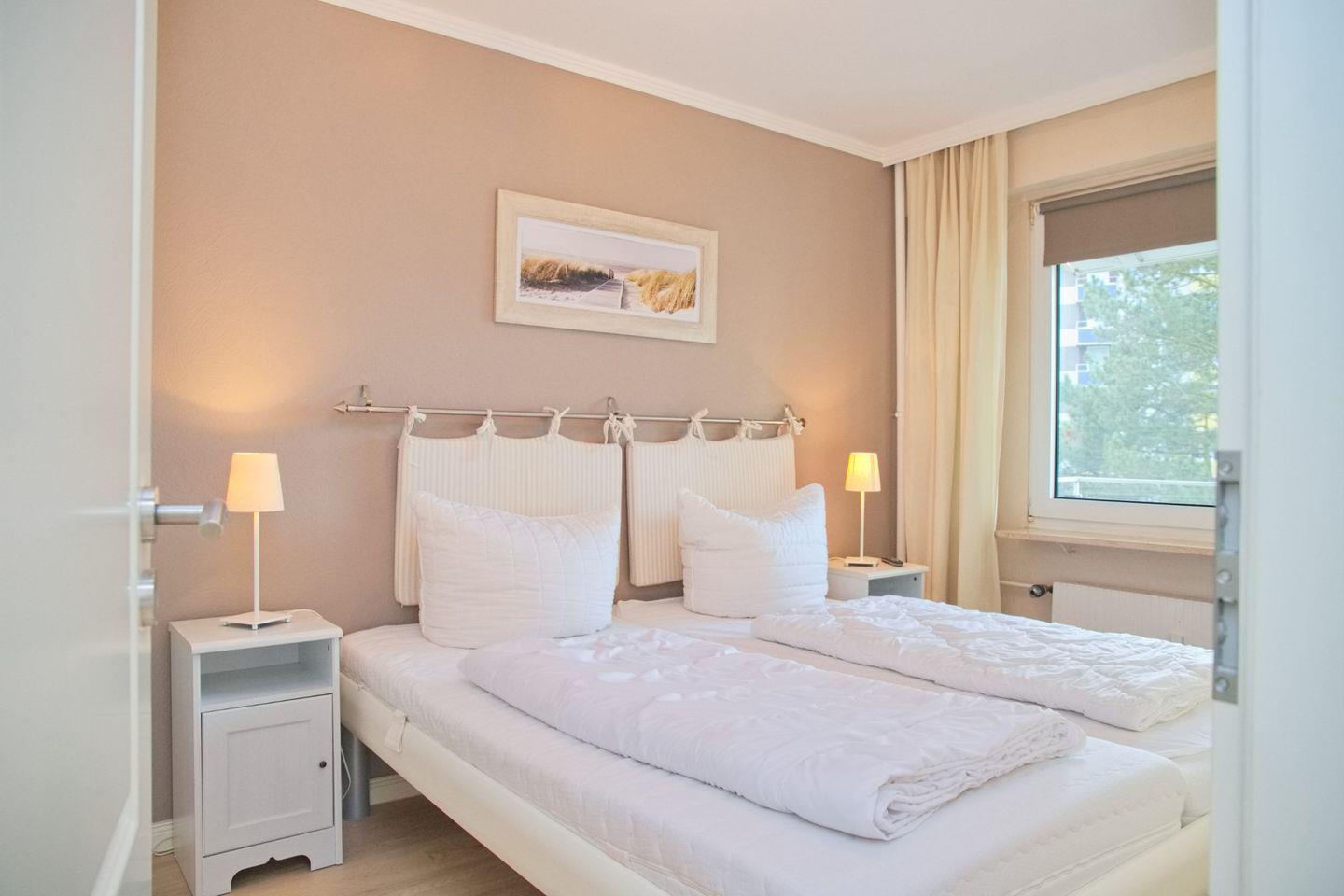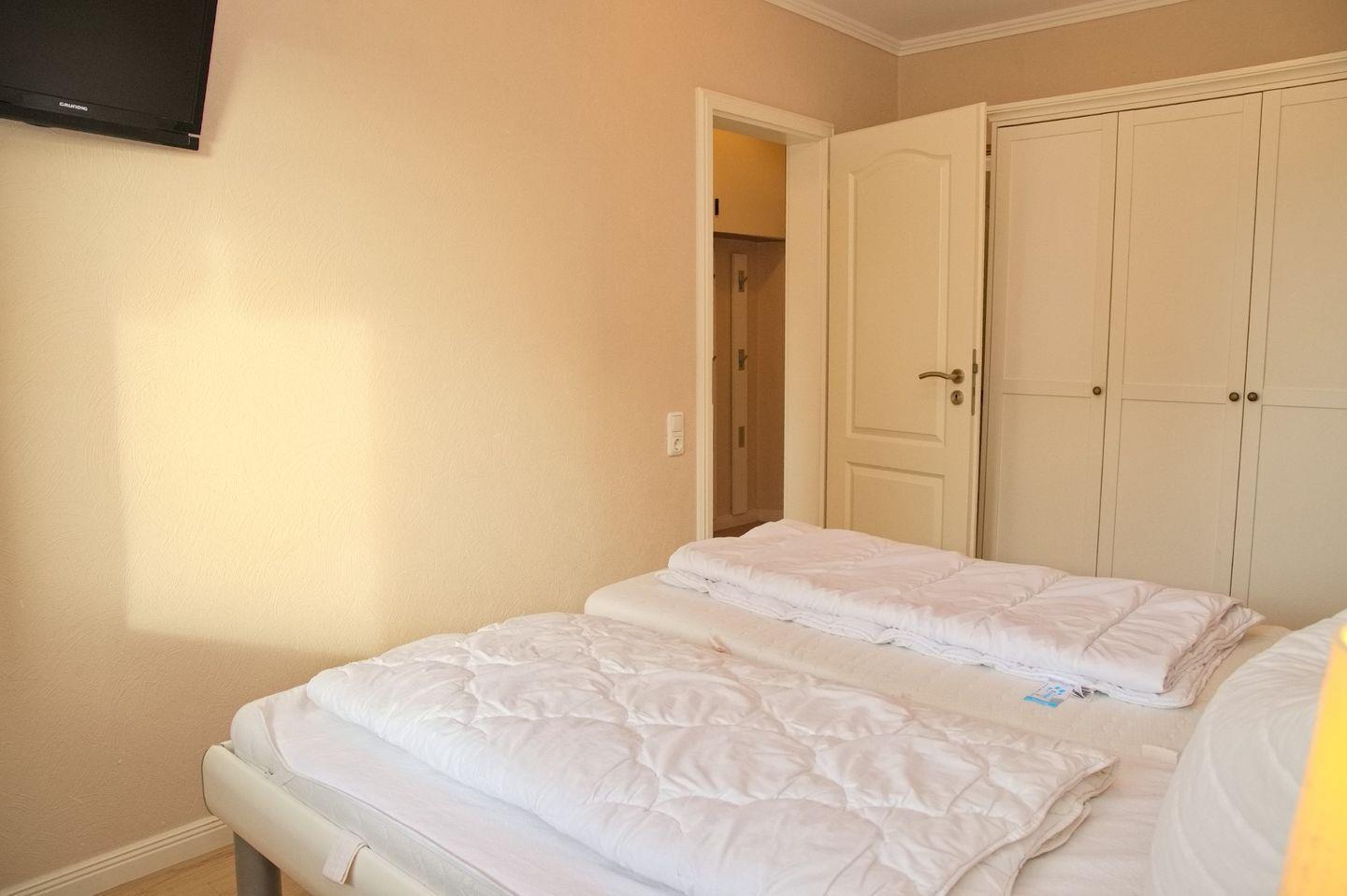 Weiter leitet Sie der Flur in das separate Schlafzimmer. Hier steht Ihnen neben einen großen Kleiderschrank ein bequemes Doppelbett (2x90x200 cm) mit Nachttischen. Ein Verdunklungsrollo sorgt für die nächtliche Ruhe. Starten Sie den Tag mit einem herrlichen Blick auf die tosende See.