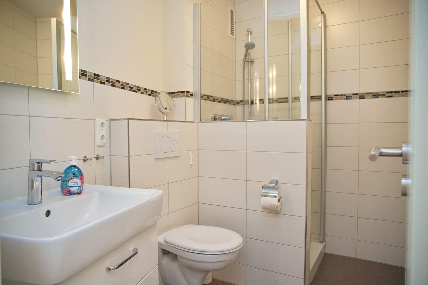 Gleich links finden Sie das Moderne Duschbad mit Glastüren, WC und Waschtisch mit beleuchteten Spiegel.