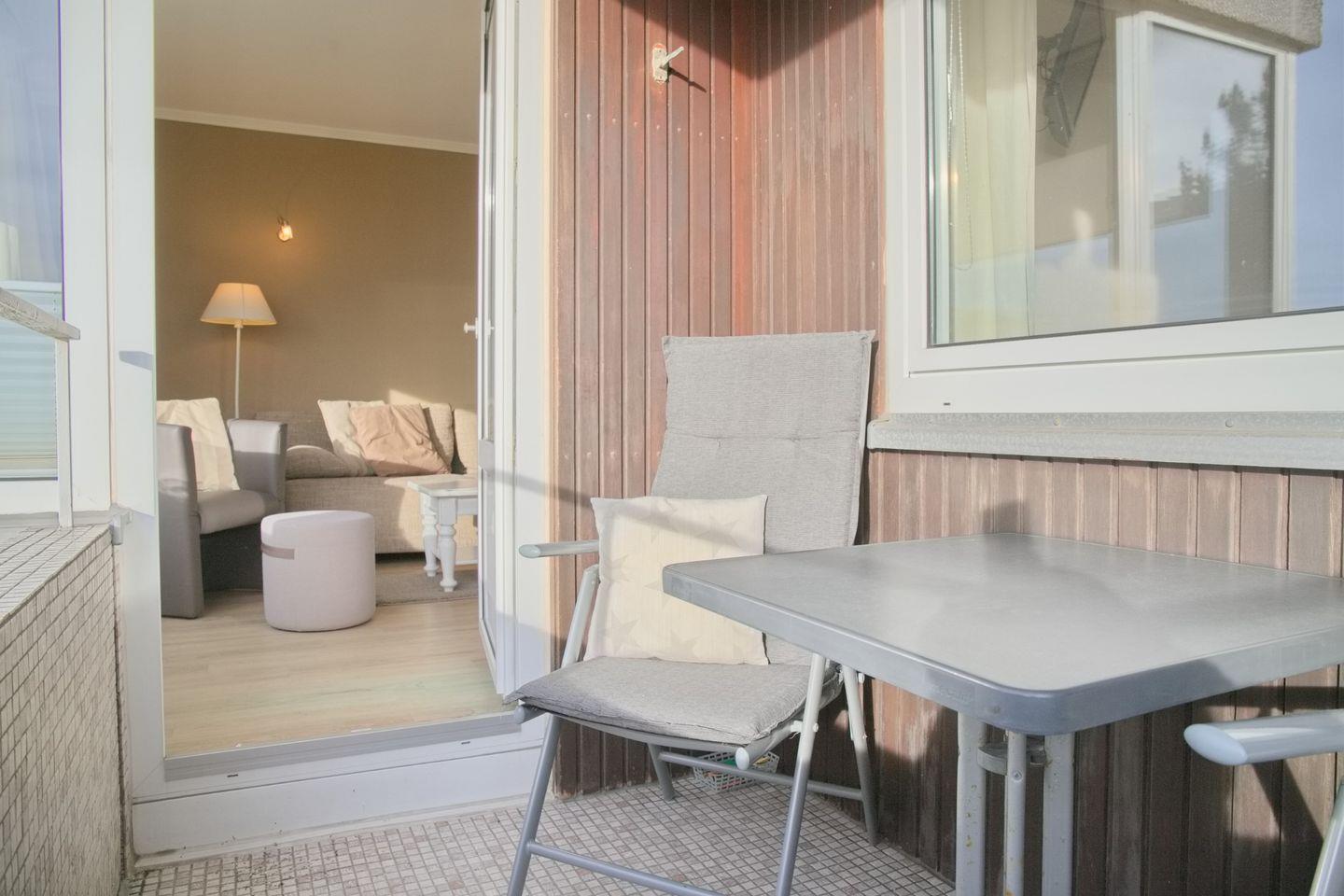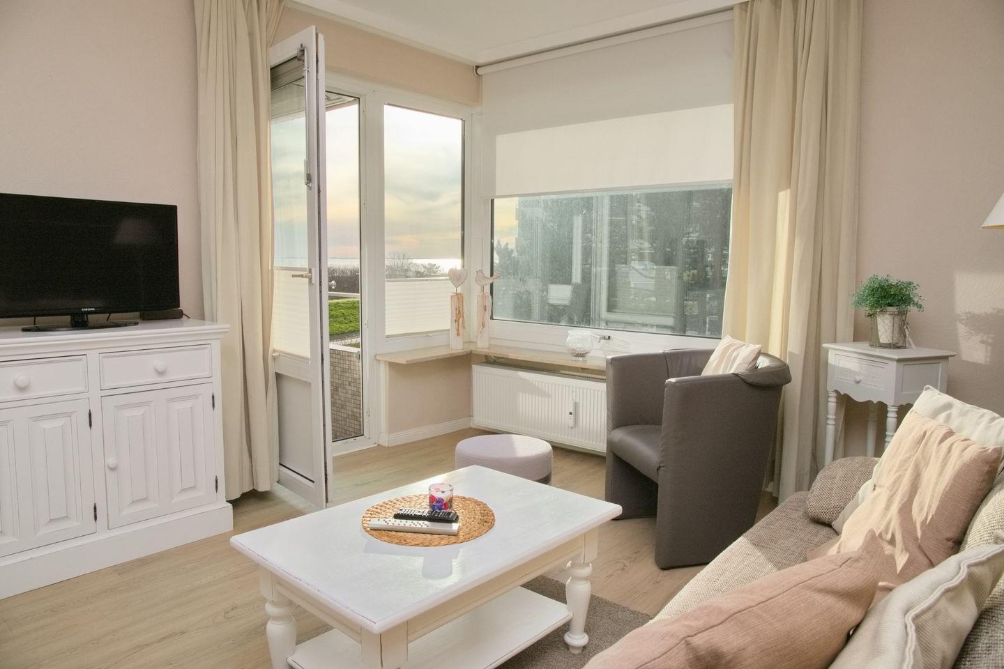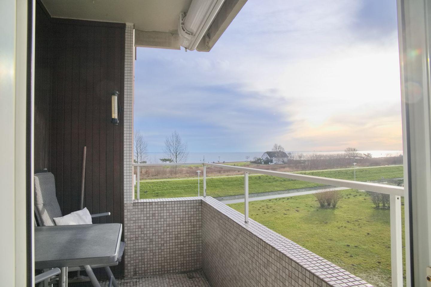 Liebevoll gestaltete Ferienwohnung in einer gepflegten Anlage direkt hinter dem Deich. Genießen Sie vom möblierten Balkon den Blick auf die Ostsee.
