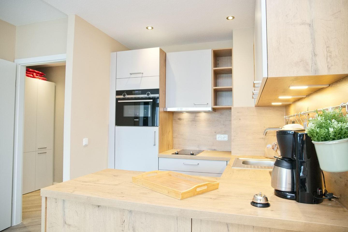 Die vollausgestattete Küche lässt keine Wünsche offen und verfügt über ein 2er Ceranfeld, eine Mikrowelle mit Backofenfunktionen, einem komfortablen Kühlschrank mit Gefrierfach, eine Spülmaschine mit Expressfunktion, einen Toaster, eine Kaffeemaschine und einen Wasserkocher - ideal für die Zubereitung Ihrer Lieblingsgerichte.