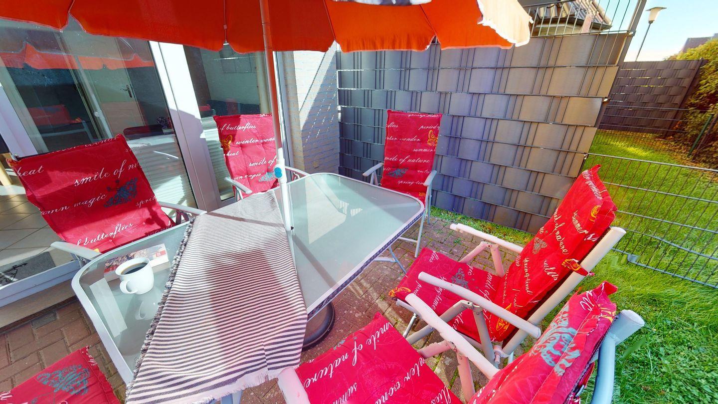 Bei schönem Wetter erwartet Sie die möblierte Terrasse in Südausrichtung mit einem Grill. Bollerwagen stehen Ihnen je nach Verfügbarkeit kostenlos zur Verfügung.