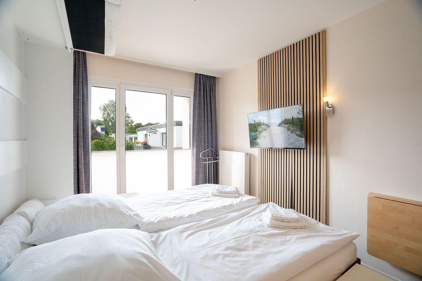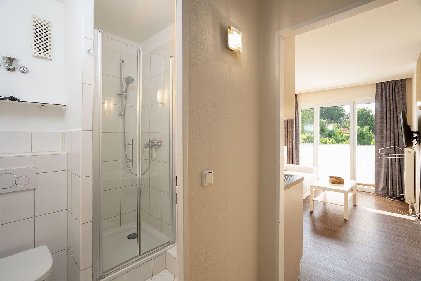 Nur wenige Gehminuten vom Strand entfernt befindet sich diese schöne 18 m² Ferienwohnung im 1. Stock, die Platz für 1-2 Personen bietet – auch Ihr Hund ist willkommen. Die Wohnung verfügt über einen hellen Wohnbereich mit einem Sofa-Schrankbett für 2 Personen. Das Badezimmer ist mit einer Dusche ausgestattet. Die Wohnung wird durch eine kleine Küchenzeile mit einem Essplatz sowie einen möblierten Balkon abgerundet.