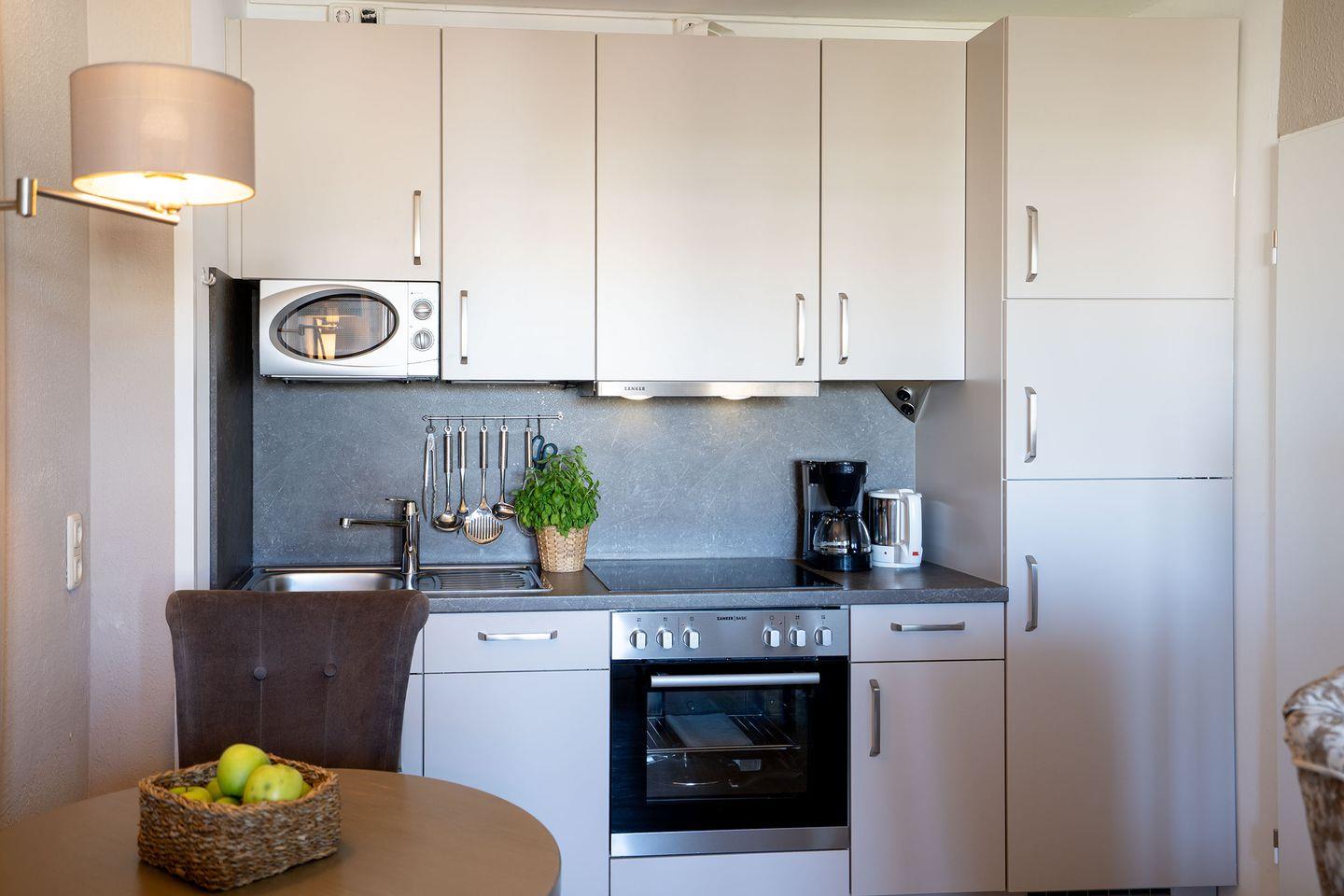 Die gut ausgestattete Küchenzeile mit angrenzender Essecke bietet alles, was Sie für die Zubereitung Ihrer Mahlzeiten benötigen. Der großzügige, möblierte Balkon lädt dazu ein, die frische Luft und entspannte Stunden im Freien zu genießen.