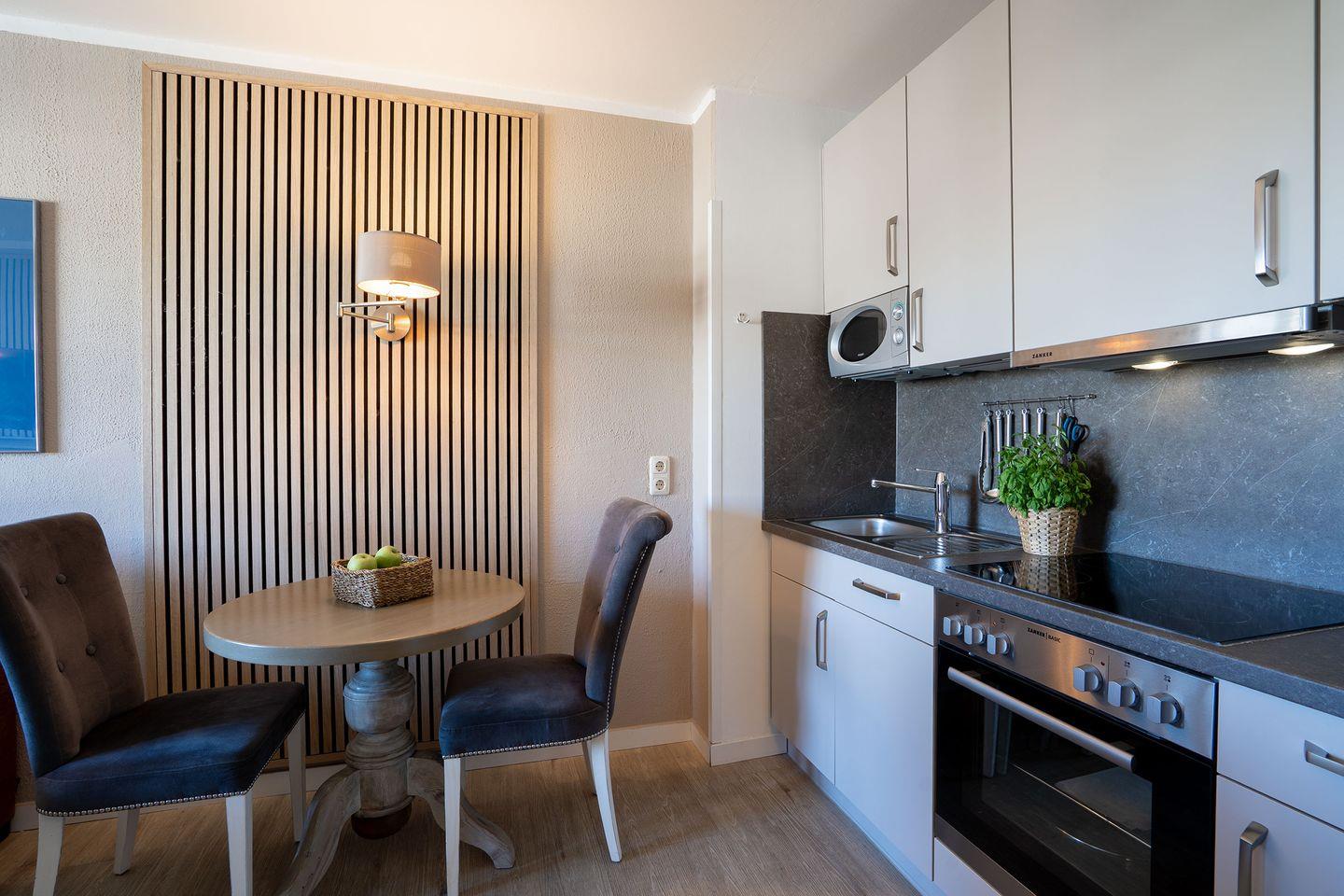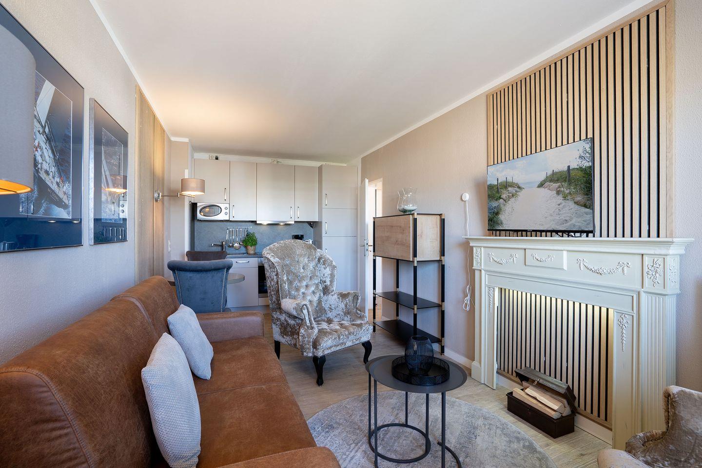 Diese stilvolle 43 m² große Ferienwohnung im 1. Stock bietet die perfekte Unterkunft für Paare oder Alleinreisende, die Erholung und Komfort suchen. Nur wenige Gehminuten vom Strand entfernt, lädt sie zum Entspannen ein – auch Ihr Hund ist herzlich willkommen.
