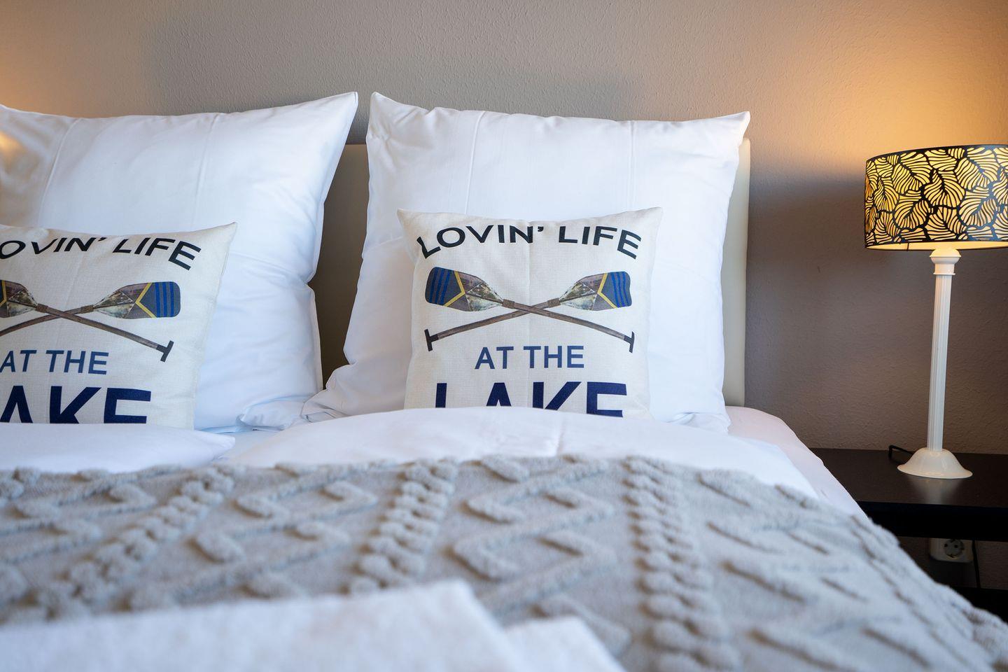 Die Wohnung verfügt über ein gemütliches Schlafzimmer mit Doppelbett und Verdunklungsmöglichkeiten für erholsame Nächte. Auf Wunsch stellen wir Ihnen ein Kinderbett und einen Hochstuhl zur Verfügung. Das Badezimmer ist mit einer modernen Dusche ausgestattet.