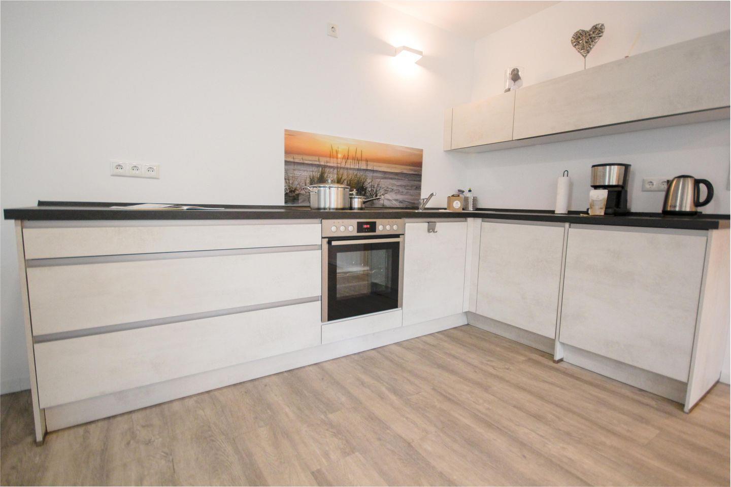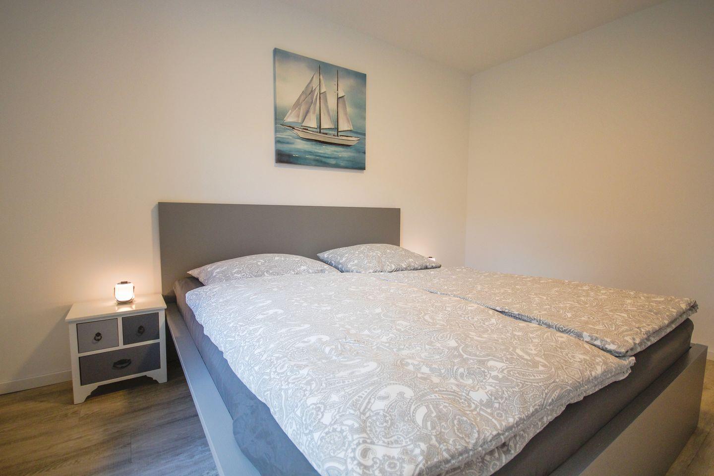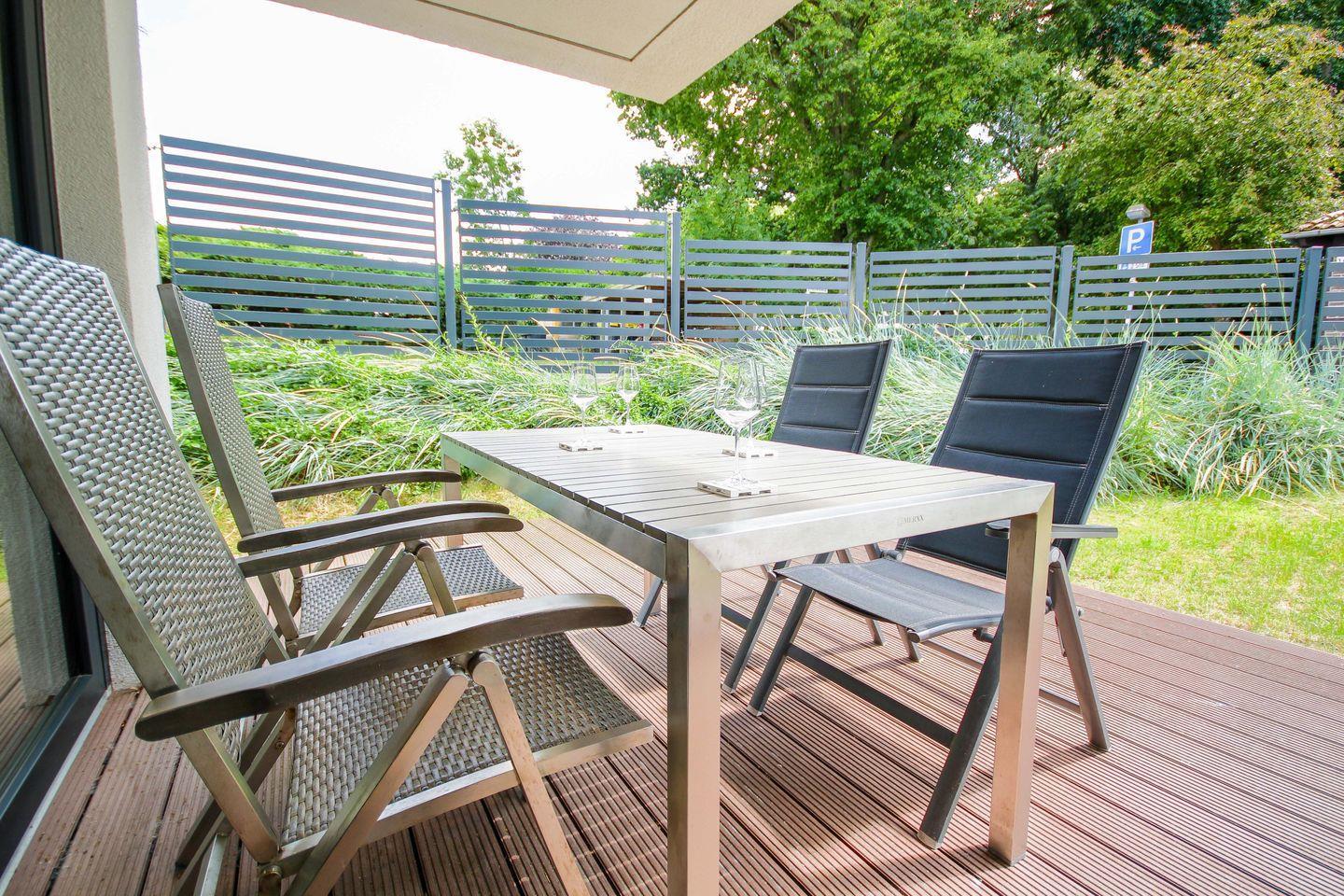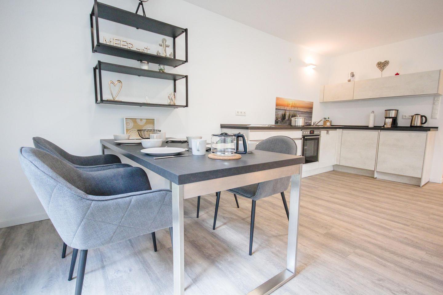 Gemütliche 76m² haustierfreundliche Ferienwohnung mit möblierter Terrasse, zwei Schlafzimmern, offenem Wohn- und Essbereich mit voll ausgestatteter Küchenzeile sowie modernem Bad mit ebenerdiger Dusche – ideal für einen entspannten Urlaub in stilvollem Ambiente.