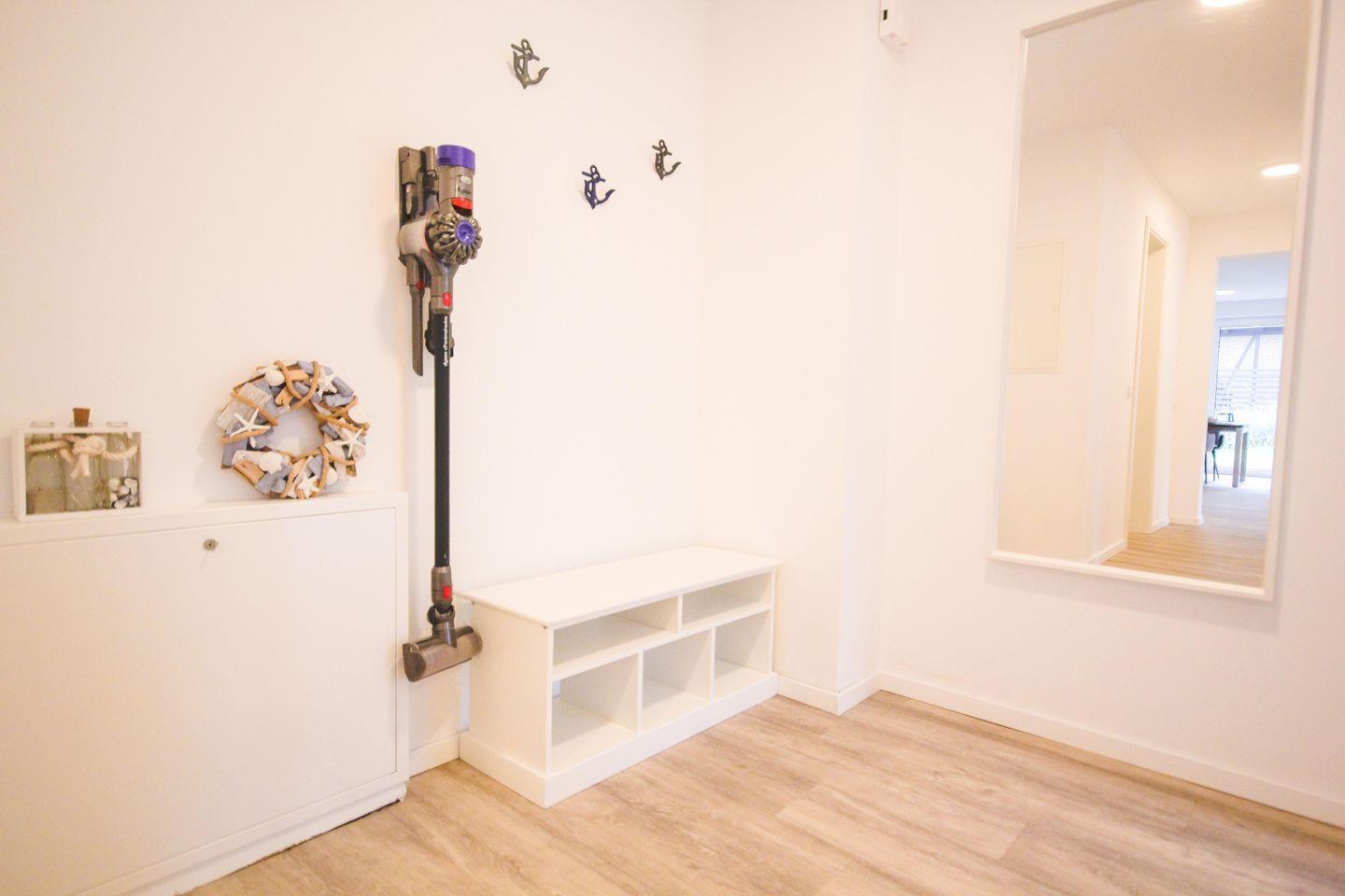 Ein kleiner Flur mit Garderobe und Schuhschrank führt zu den beiden Schlafzimmern, die jeweils mit einem komfortablen Doppelbett, offenen Kleiderschränken und Vorhängen ausgestattet sind – ideale Rückzugsorte für erholsame Nächte.