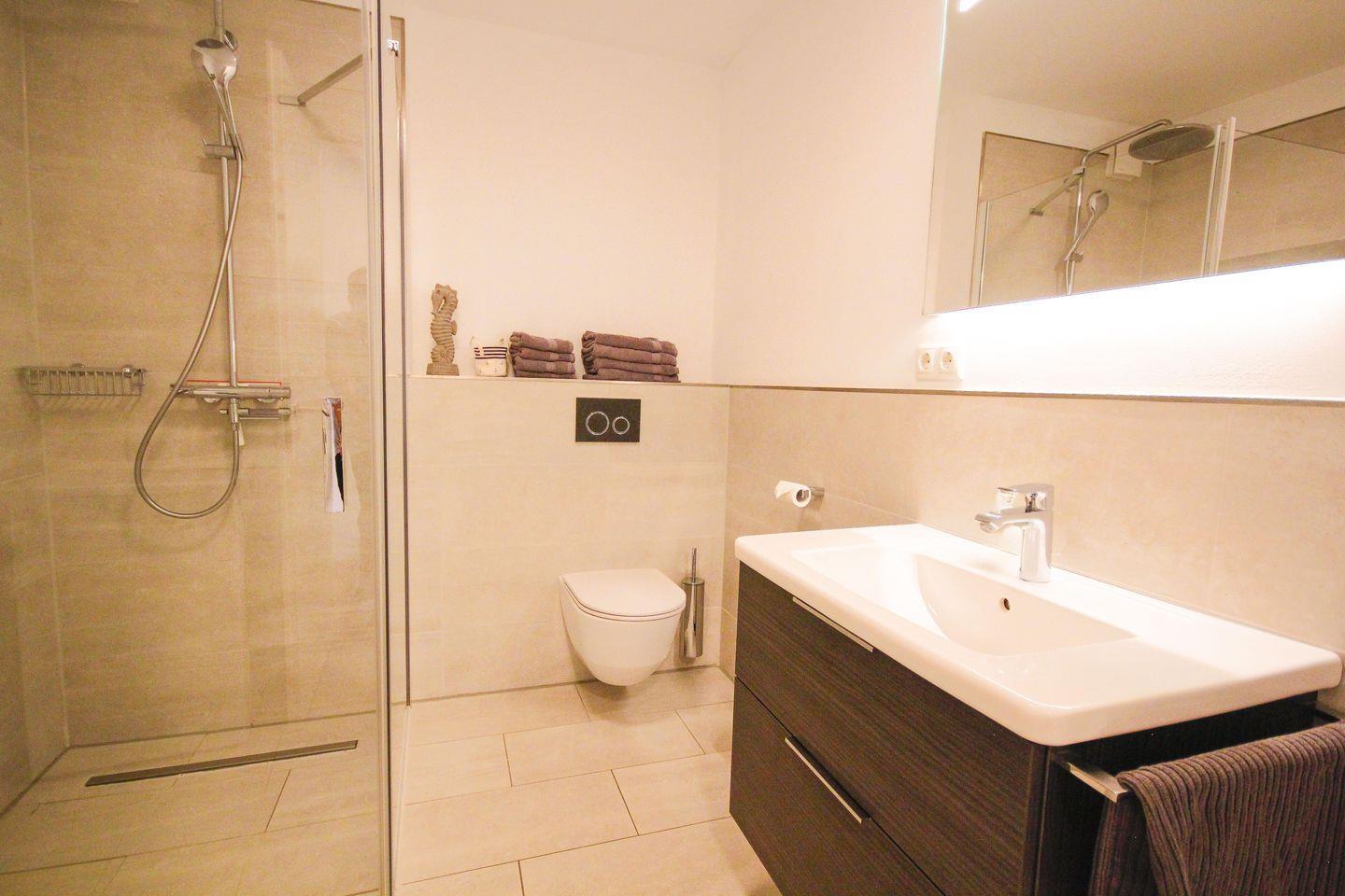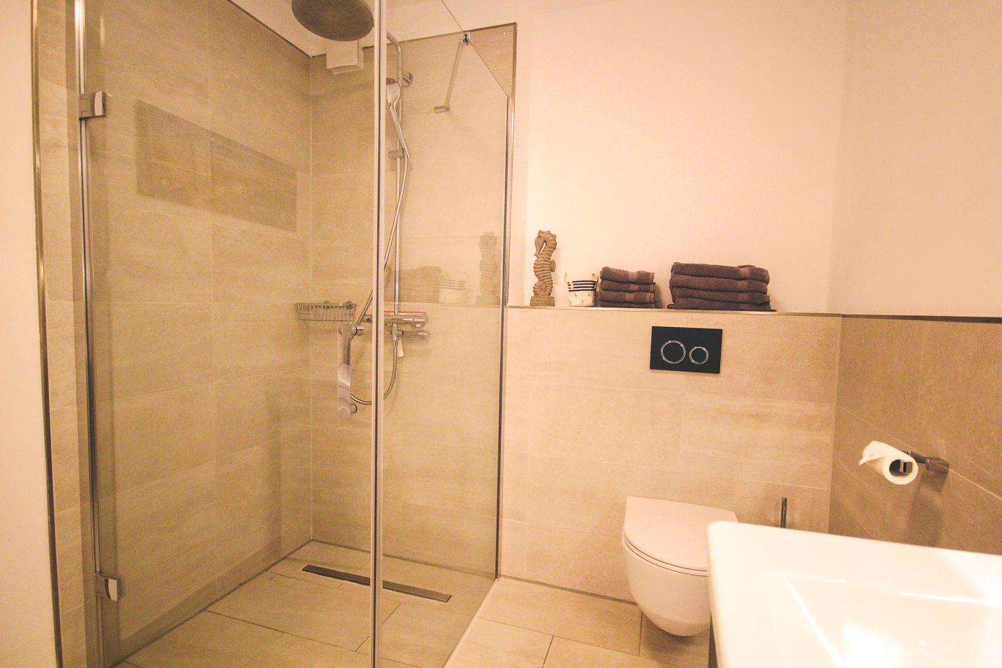 Das moderne Badezimmer bietet Ihnen eine ebenerdige Dusche, ein WC sowie einen stilvollen Waschtisch – hier beginnt jeder Tag mit Komfort.