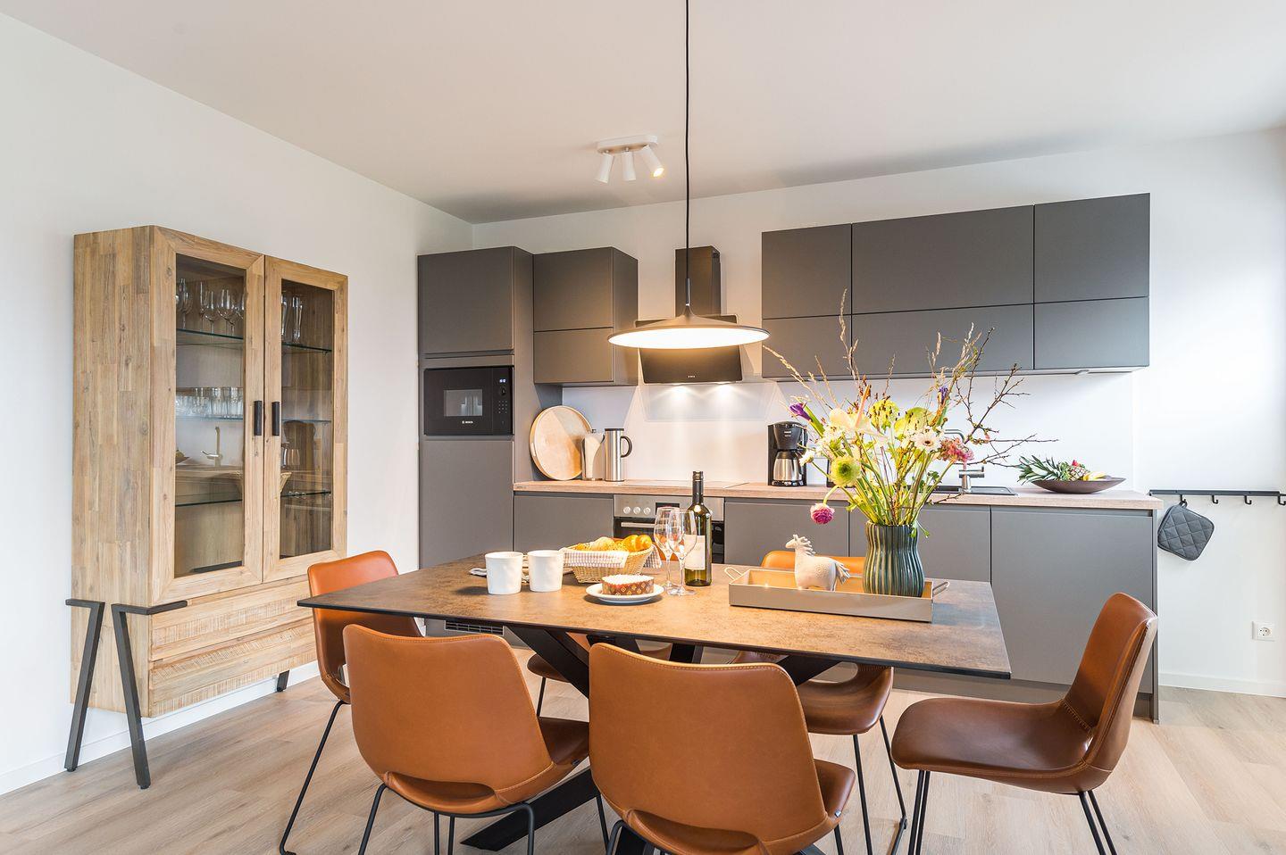 Sie ist für bis zu 4 Personen (der angegebene Preis bezieht sich immer auf 2 Erwachsene und 2 Kinder, extra Personen können ggf. auf Anfrage dazu gebucht werden) buchbar (2 Schlafzimmer mit Doppelbetten 180 x 200 cm) und verfügt über eine gehobene 5-Sterne-Ausstattung: 2 Badezimmer, 1 Sauna, 1 Whirlwanne sowie 1 Balkon (frontaler Meerblick). Die Küche ist komplett ausgestattet und bietet einen großen Esstisch für bis zu 6 Personen. Zudem gibt es einen Geschirrspüler, einen Kühlschrank inkl. Gefrierfach, eine Mikrowelle sowie einen Waschtrockner. Im Wohnbereich erwartet