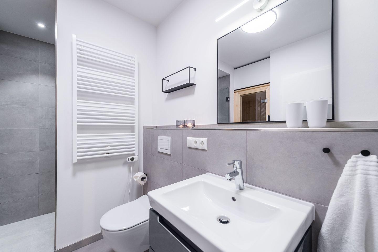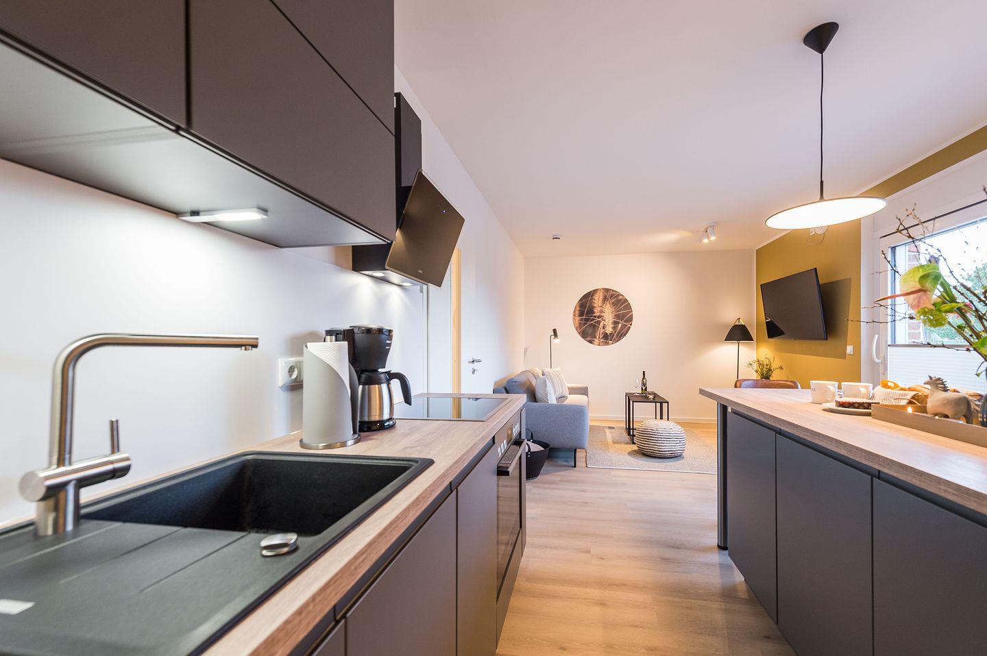 Sauna, 1 Whirlwanne sowie 1 Balkon (seitlicher Meerblick). Die Küche ist komplett ausgestattet und bietet zudem einen Esstisch. Zudem gibt es einen Geschirrspüler, einen Kühlschrank inkl. Gefrierfach, eine Mikrowelle sowie einen Waschtrockner. Im Wohnbereich erwartet Sie ein 55-Zoll-Smart-TV sowie
