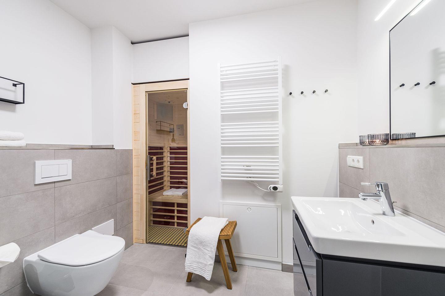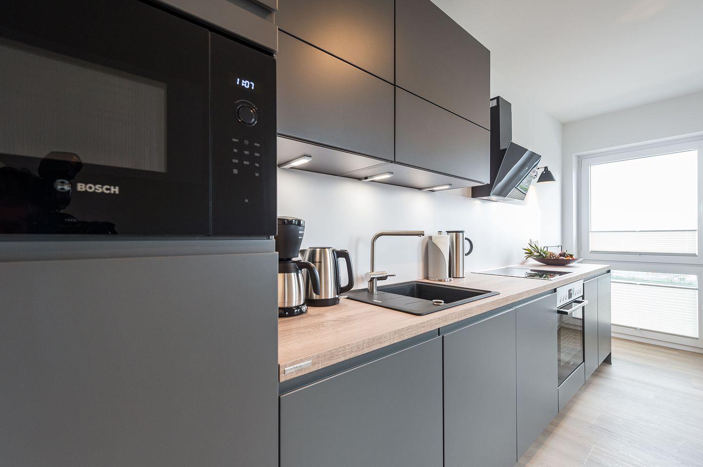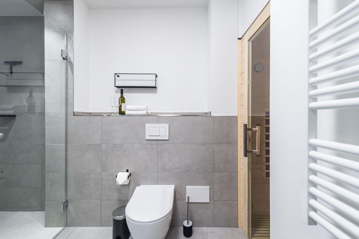 Sie ist für bis zu 2 Personen buchbar (1 Schlafzimmer mit Doppelbett 180 x 200 cm) und verfügt über eine gehobene 5-Sterne-Ausstattung: 1 Badezimmer, 1 Infrarotkabine sowie 1 Dachterrasse (frontaler Meerblick). Die Küche ist komplett ausgestattet und bietet zudem einen Esstisch für bis zu 4 Personen. Zudem gibt es einen Geschirrspüler, einen Kühlschrank inkl. Gefrierfach, eine Mikrowelle sowie einen Waschtrockner. Im Wohnbereich erwartet Sie ein 50-Zoll-Smart-TV sowie der Zugang zur Dachterrasse. Die Dachterrasse ist ebenfalls mit einem Esstisch ausgestattet und bietet einen herrlichen, frontalen Blick auf die Ostsee. Selbstverständlich bieten wir schnelles und kostenfreies WLAN sowie einen PKW-Stellplatz direkt am Haus. Auf den hauseigenen Parkplätzen stehen Ihnen E-Auto-Ladegeräte (Wallboxen) zur Verfügung (gegen Gebühr). Aufgrund der Allergiker gerechten Ausstattung sind Haustiere nicht erlaubt.