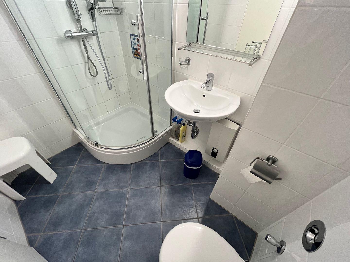 Das Badezimmer ist modern und verfügt über eine Eckdusche.