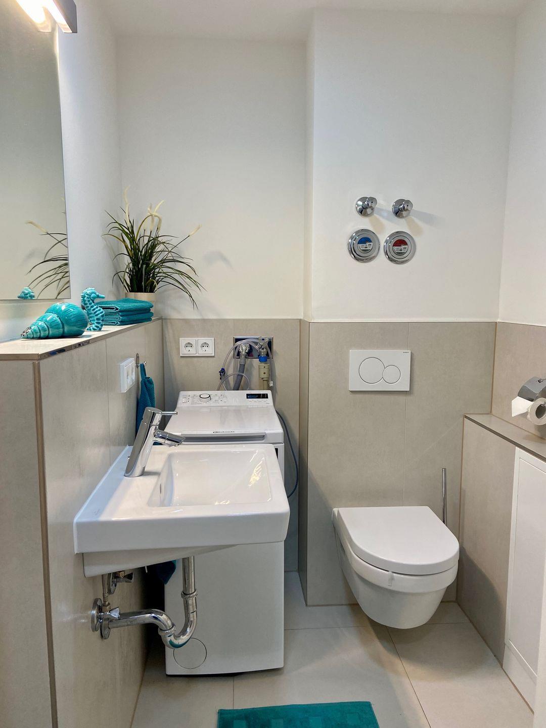 Ein großes Badezimmer mit Raindance-Dusche und Doppelwaschbecken sind selbstverständlich. Außerdem verfügt die Wohnung über ein Gäste-WC mit Waschmaschine.