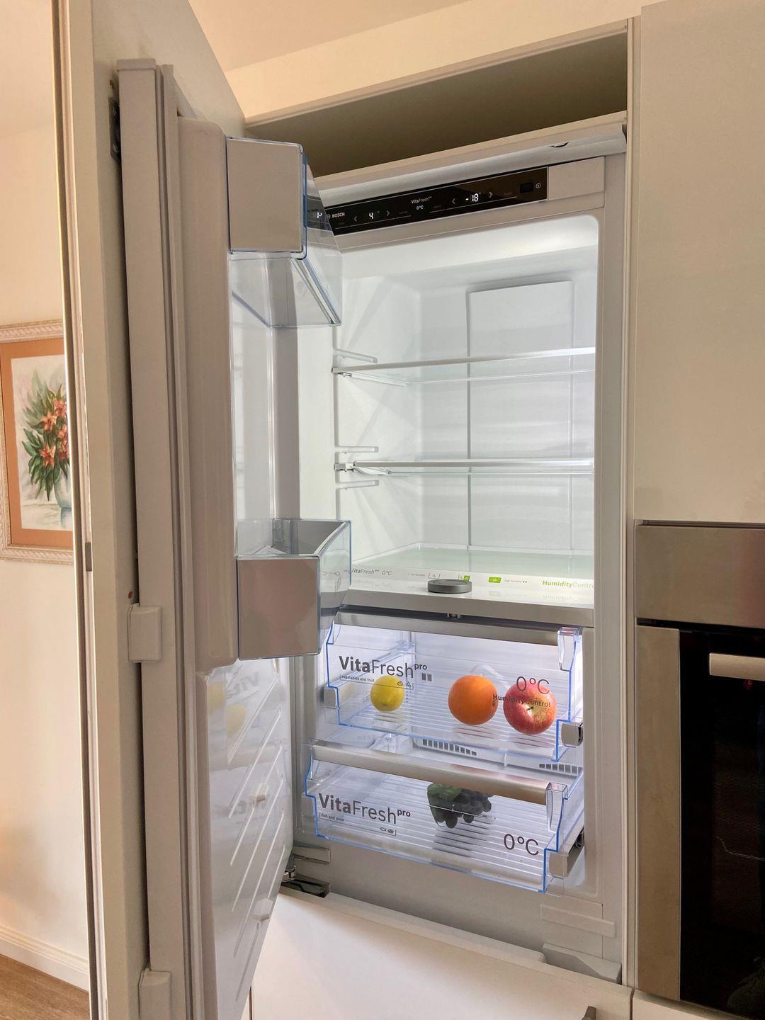 Das helle, elegante Schlafzimmer hat ein Doppelbett (2 x 90x200 cm) mit einem großen Kleiderschrank und Zugang zum Balkon zur Ostseite, auf der Sie schon morgens gemütlich eine Tasse Kaffee in der Sonne trinken können. Die voll ausgestattete Küche mit einem "Vita fresh" - Kühlschrank, Backofen und Mikrowelle ist zum Essbereich offen gestaltet und ein geschmackvoll eingerichteter Wohnraum mit Schlafsofa ( für eine Person geeignet) runden diese Wohnung ab. Der 2. Balkon führt vom Wohnzimmer zur Westseite der Wohnung. Hier genießen Sie die Abendsonne. Von beiden Balkonen haben Sie einen spektakulären Blick in die Natur und auf den Golfplatz.