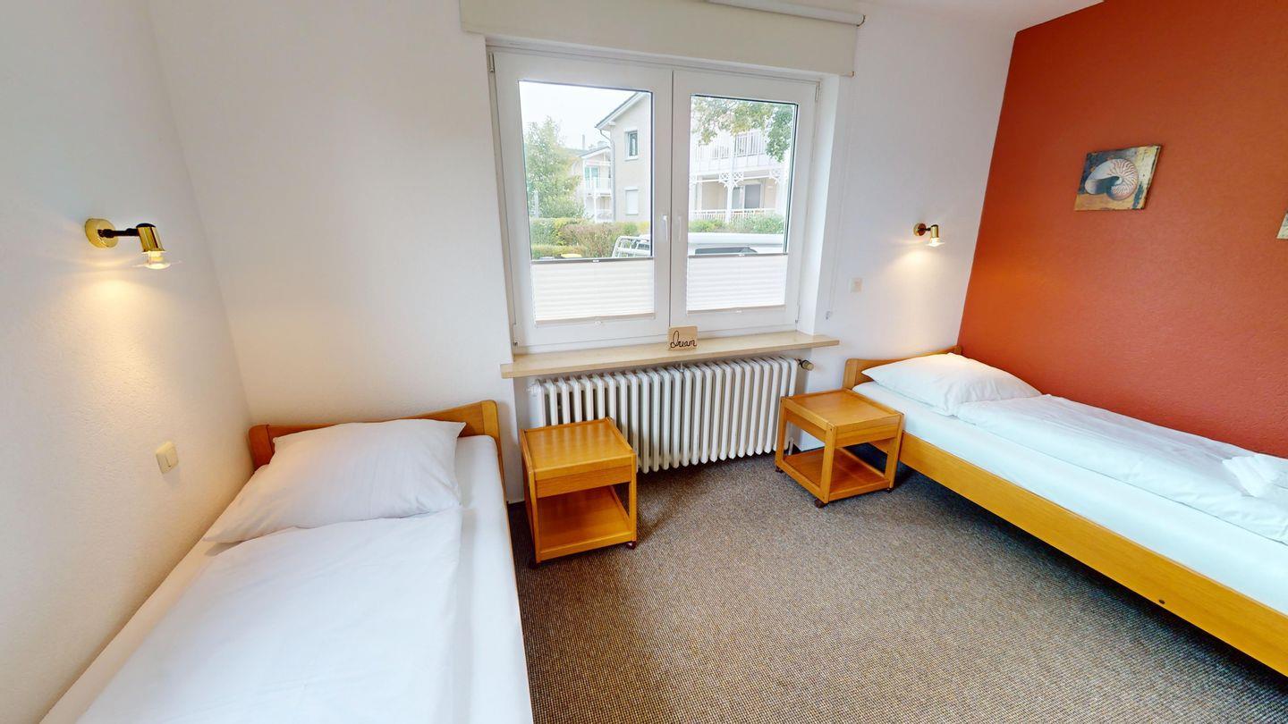 Die Wohnung teilt sich auf in ein Wohn-/Esszimmer, 2 Schlafzimmer (eins mit Doppelbett, eins mit 2 Einzelbetten), einer Küche mit Durchreiche, einem Bad mit zwei Waschbecken und einem separaten WC.