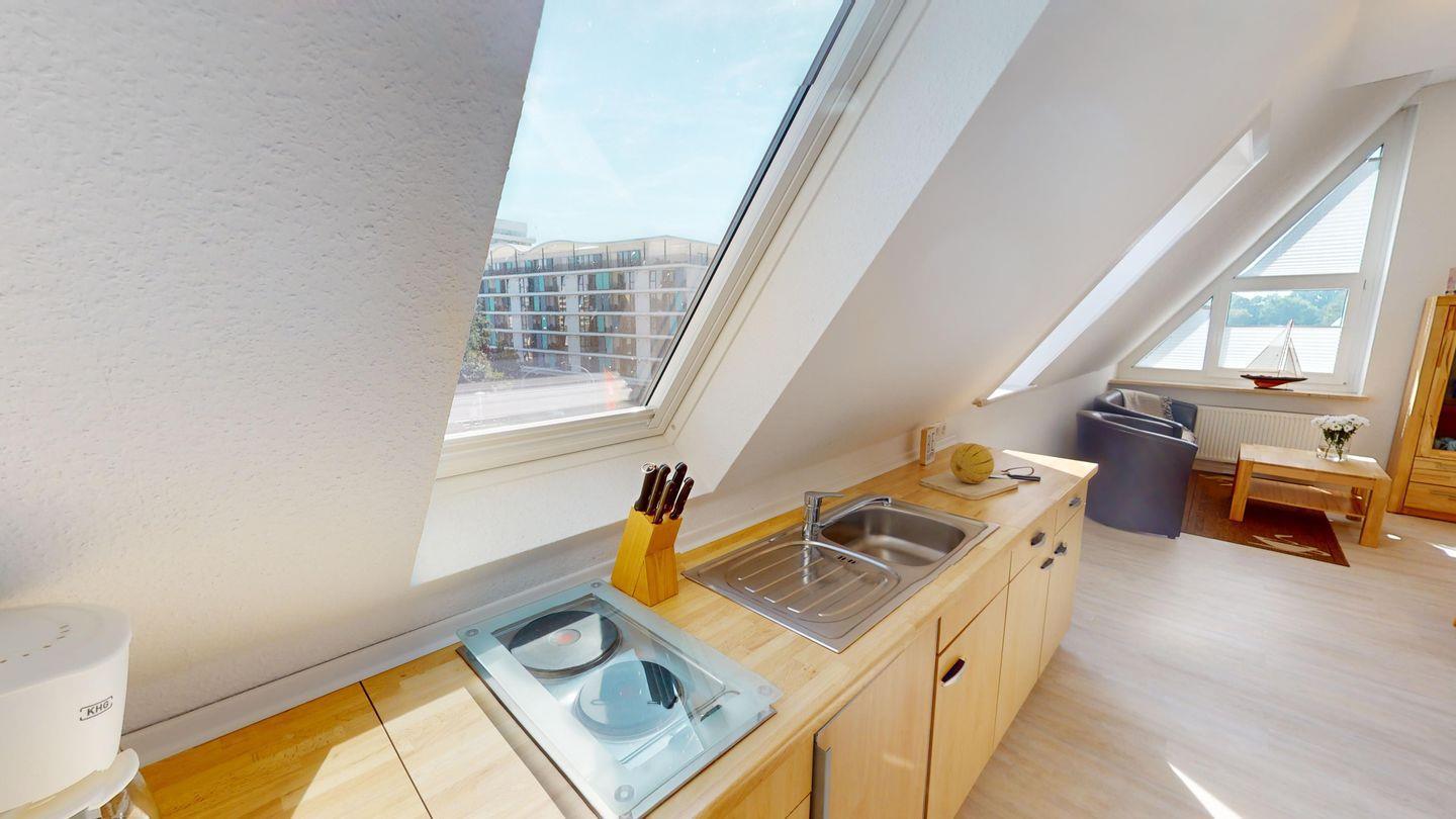 Ein Wohnzimmer, eine in die Schräge integrierte Küchenzeile mit Mikrowelle (+Grillfunktion), ein Schlafzimmer mit Doppelbett und ein Duschbad sind in dieser Wohnung vorhanden.
