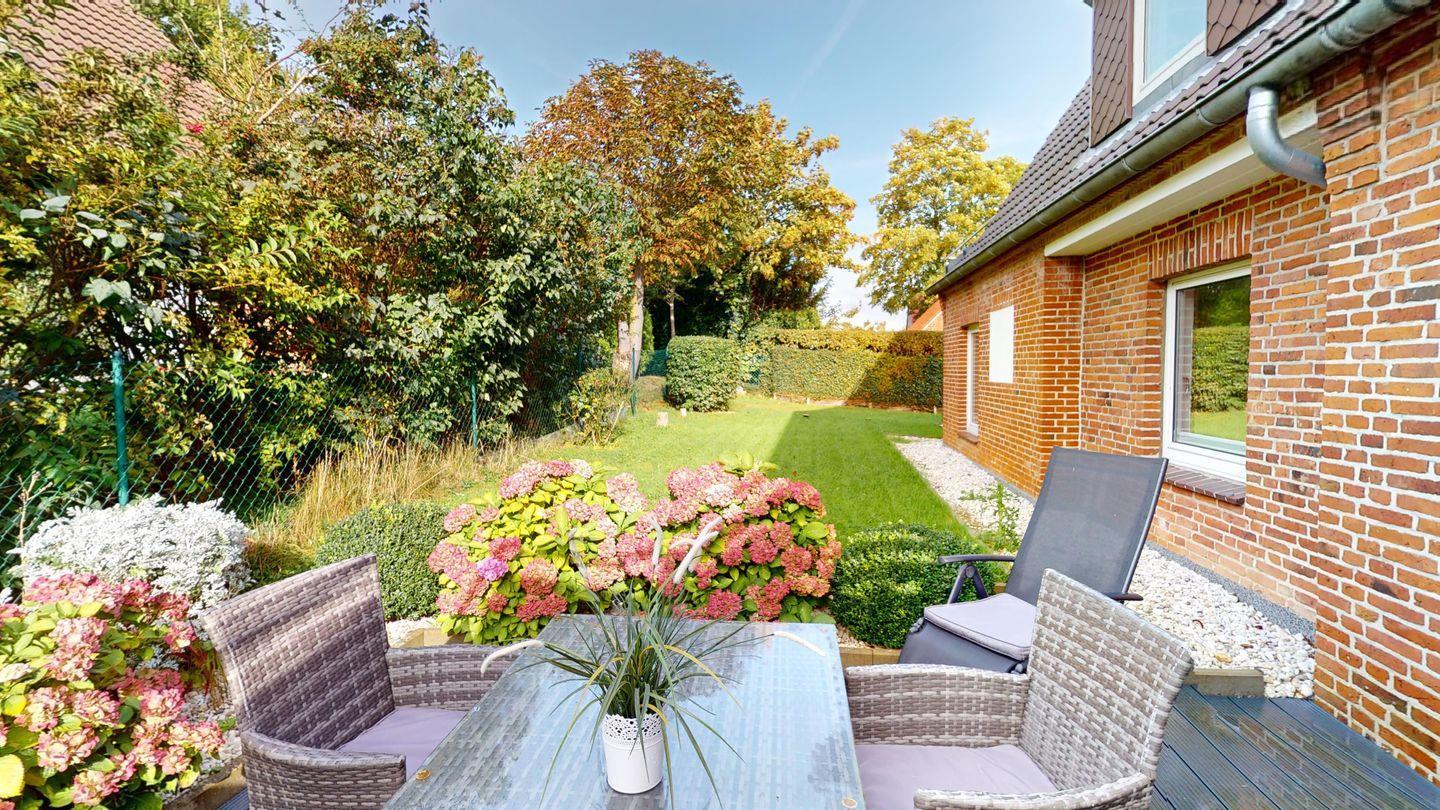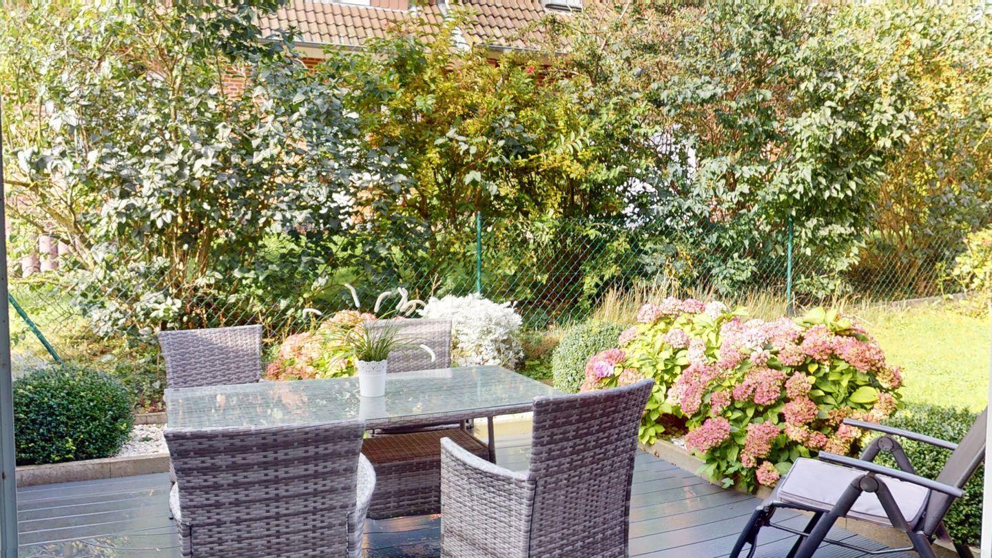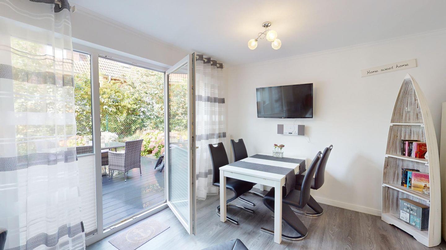 Der helle Wohnraum mit Sitzecke und Essplatz führt zur eigenen Terrasse, die an den Garten angrenzt und auch in den Abendstunden gern genutzt wird. Im Garten befindet sich zusätzlich ein großer, gemeinschaftlich genutzter Grillplatz.