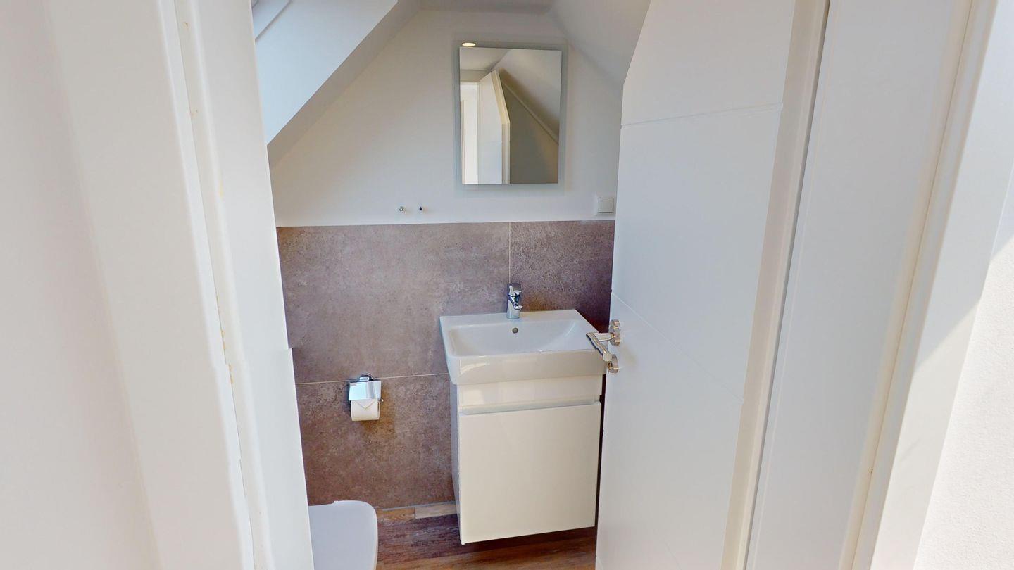 Eins der Schlafzimmer liegt im Dachgeschoss (zwei Einzelboxspringbetten), hier befindet sich auch ein kleines Bad mit WC.