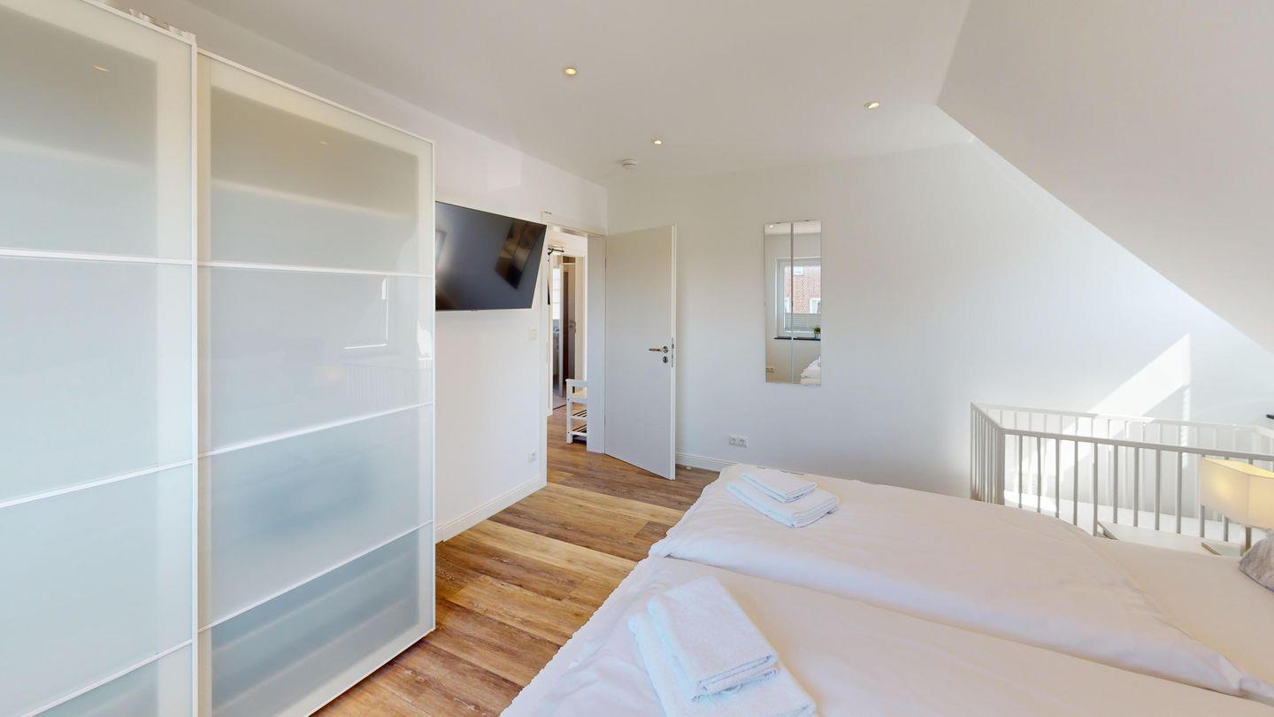 In der Wohnebene sind die anderen zwei Schlafzimmer, beide mit Doppelbett. Eins der Schlafzimmer hat zusätzlich ein Holz-Kinderbett. Auch das Masterbad mit Dusche liegt auf dieser Ebene.