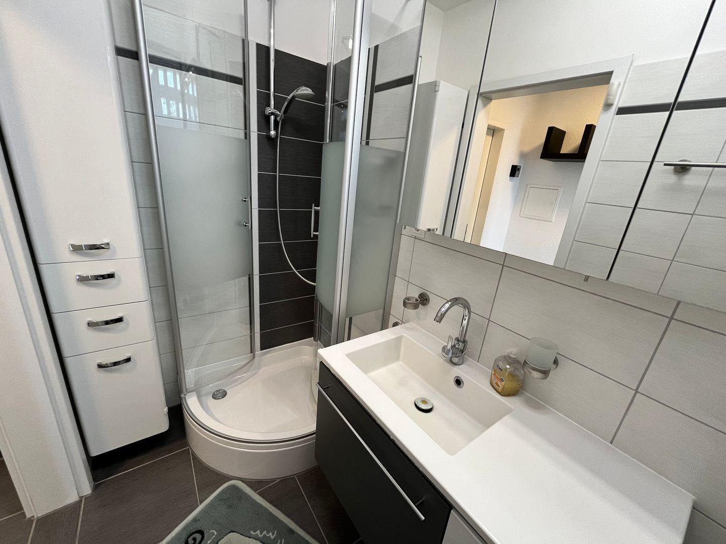 Das Badezimmer hat eine Dusche und ein Fenster. Genügend Ablagefläche finden Sie auch hier, ebenso einen Kosmetikspiegel und einen Fön.