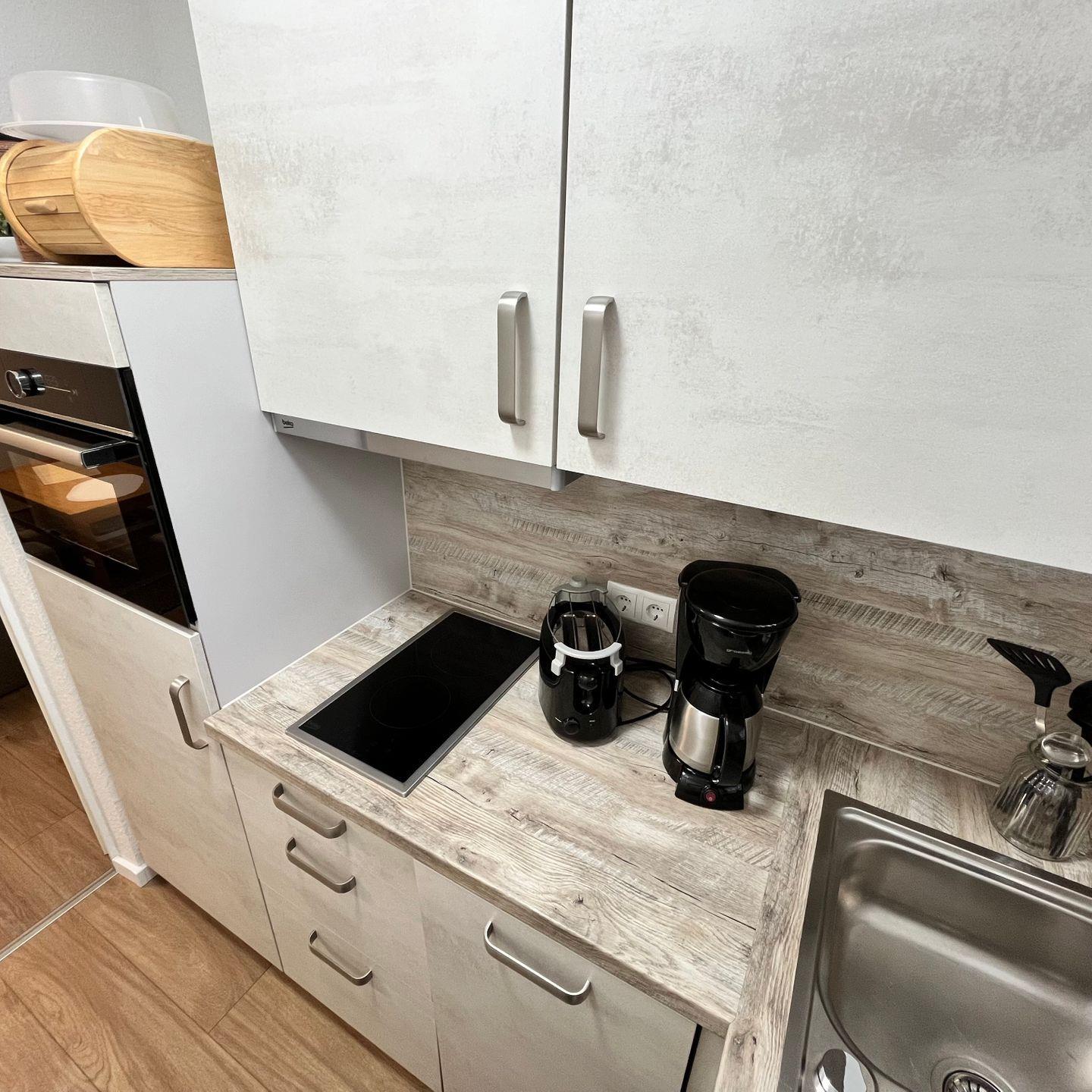 Die neuwertige Einbauküche ist mit allen nötigen Geräten ausgestattet und verfügt neben einer Spülmaschine und einem Backofen mit Mikrowellenfunktion, aber auch über eine kleine Waschmaschine.